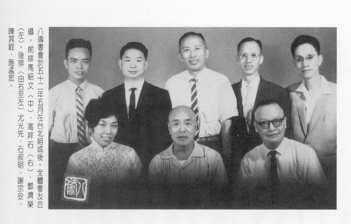 民国五十二年秋,「八俦书会」在台北市「畅流」杂誌社社长石淑明的倡议下组成。当时「八俦」成员有马绍文、高拜石、尤光先、谢宗安、石淑明、酆济荣、施孟宏等。我因经常为「畅流」杂誌的「书学」专栏写稿,虽远居南投,亦受邀参加,因而有缘与谢宗安兄结下深厚友谊。