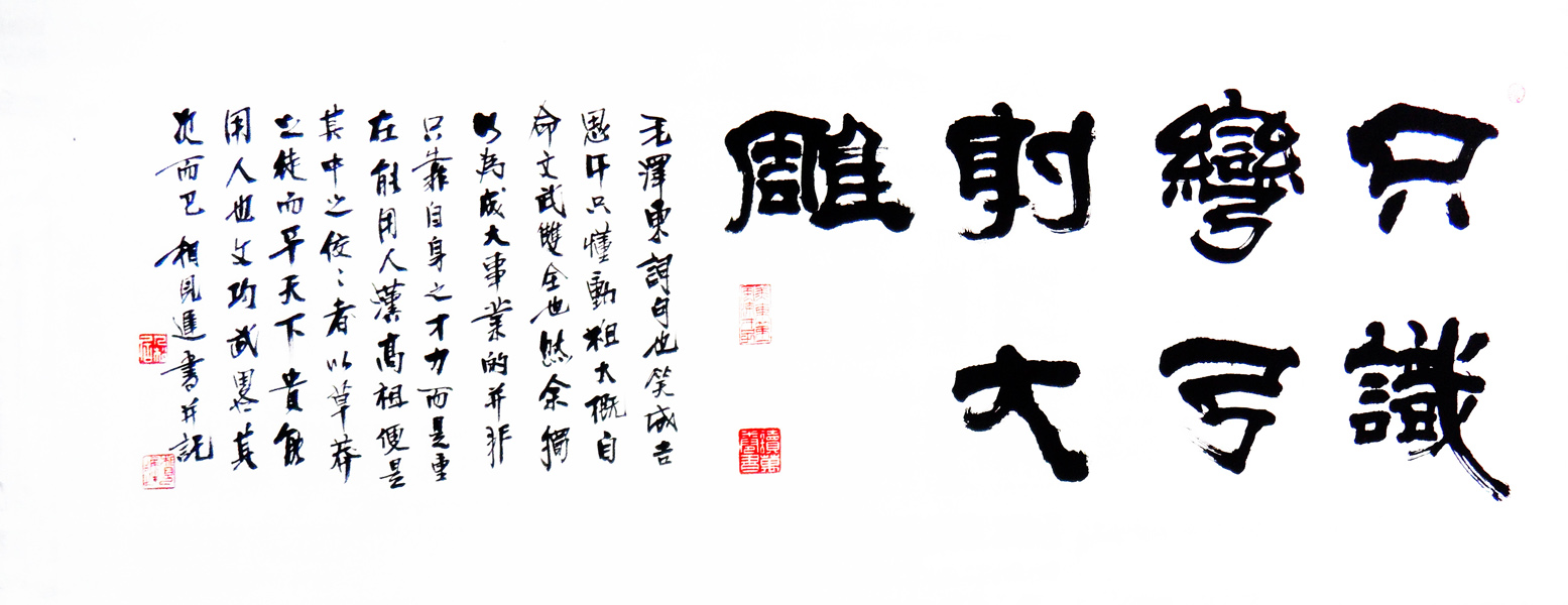 尺寸:49.5×137cm 款识:毛泽东词句也。笑成吉思汗只懂动粗,大概自命文武双全也。然余独以為成大事业的,并非只靠自身之才力,而是重在能用人。汉高祖便是其中佼佼者。以草莽之徒而能平天下,贵能用人也,文功武略其次而已。相见迟书并记。 鈐印:美东第一风流才子(朱文) 读万卷书(白文) 九松居(白文) 相见迟(朱文)