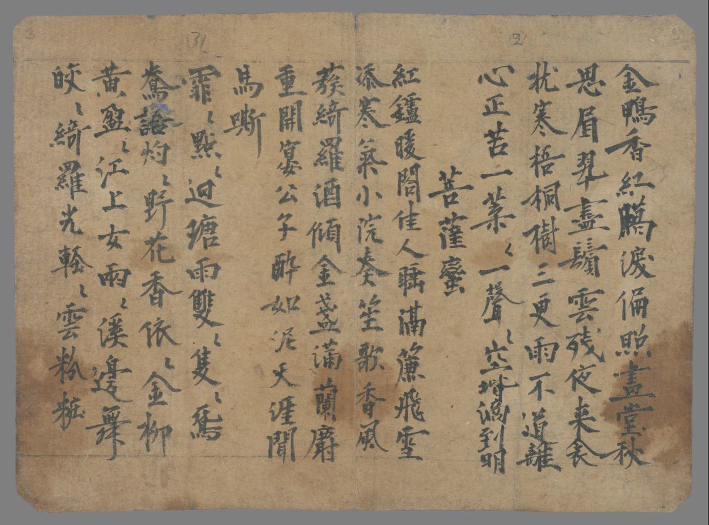 上面选录的是伯3994卷作品,最为经典。册页装,为专门的曲子词写卷。此卷合计完词五首,其中《更漏子》(三十六宫秋夜)、《菩萨蛮》(红炉暖阁佳人睡)二词,为五代词人欧阳炯作品,见《尊前集》;《更漏子》(金鸭香红蜡泪)为晚唐词人温庭筠作品,见《花间集》。温庭筠为并州太原人,欧阳炯为益州华阳人,他们均为花间词人,其活动与西北无涉。此次其他词作,主题皆关春愁秋怨,闺阁闲情,文风亦极类《花间集》,毫无边塞作品痕迹。其写卷无疑是传自中原的。