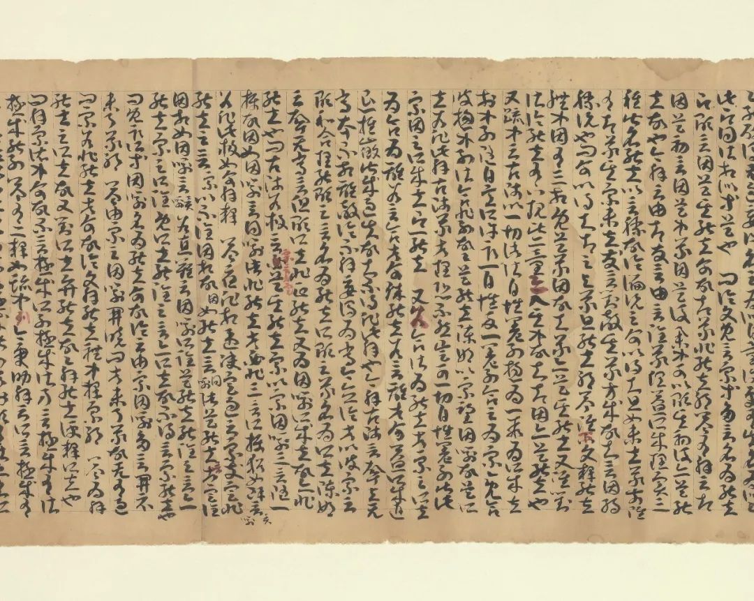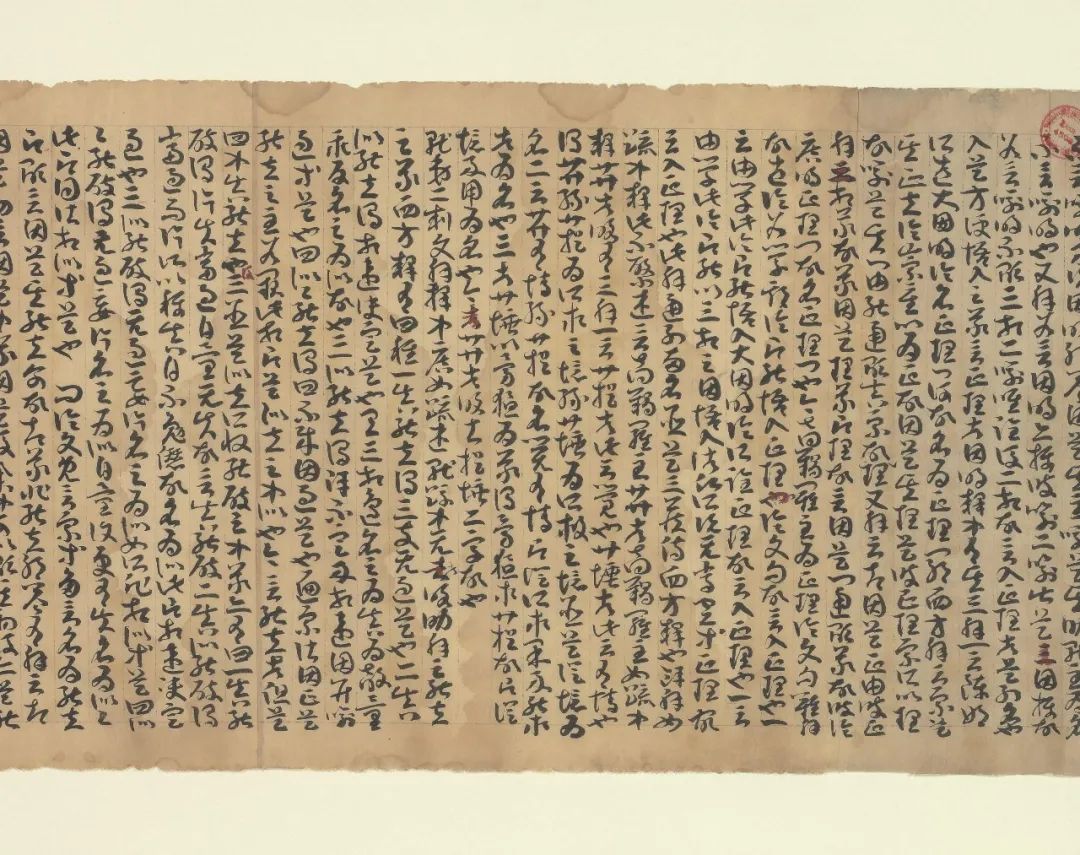 据考,此写卷产生的年代当与淨眼撰成《略抄》与《后疏》的年代相去不远,即初唐时期。这一点从其所书草字带有隶意可以推知,主要表现在字间不连绵,与章草的风格接近,然而又与章草不甚相同,即书写时已不分波磔,这是今草在普及过程中未能完全摆脱章草影响的一种特殊风格。虽然今草早在东晋二王时代即已形成,但其时章草的势力仍然很大,后来章草逐渐向今草靠近,便有了写卷中今、章相融的草书风格,这种风格的草书大概延续的时间不会太长。加上淨眼的因明疏抄在唐代流传的时间也不长,所以此写卷产生的年代当在初唐时期,至迟当不会晚于盛唐。
