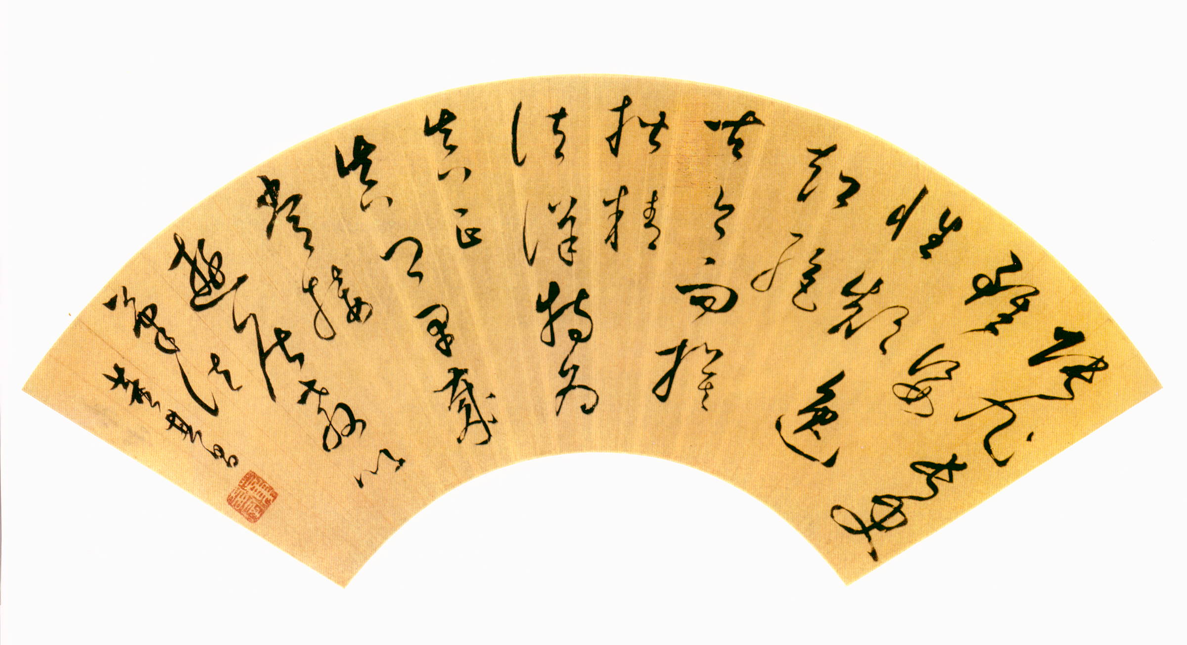 董其昌《草书节临怀素自叙帖扇面》金笺草书 15.9×48.5cm 北京故宫博物院藏 释文:张旭长史虽姿性癫逸,超绝古今,而模楷精法特为真正。真倾早岁尝接游居,教以笔法。 款署:董其昌。 【资料来源】《故宫博物院藏明清扇面(书法部分)》(人民美术出版社)