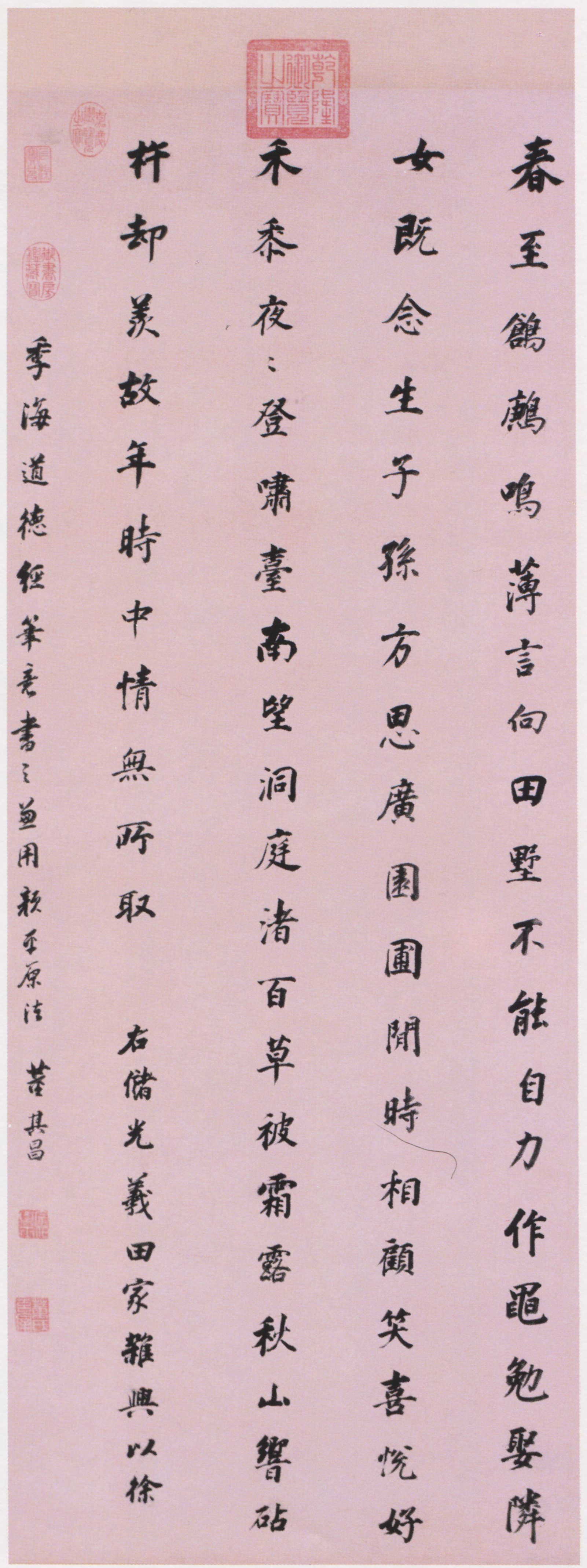 释文:略 款署:右储光义田家杂兴,以徐季海道德经笔意书之,兼用颜平原法。董其昌。 钤印:宗伯学士(白文)、董氏玄宰(朱白文) 【资料来源】《中国美术全集》书法篆刻编-5-明代书法