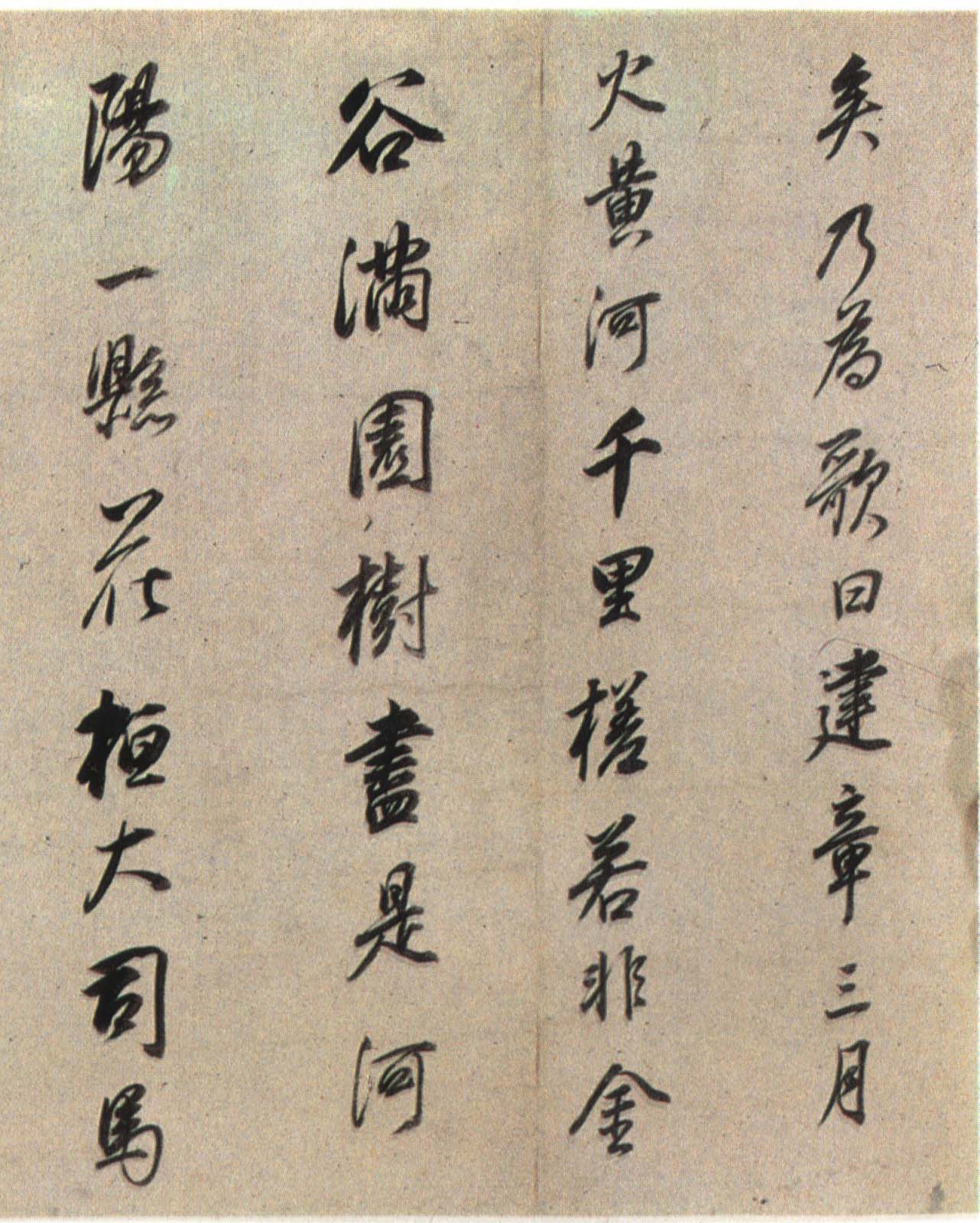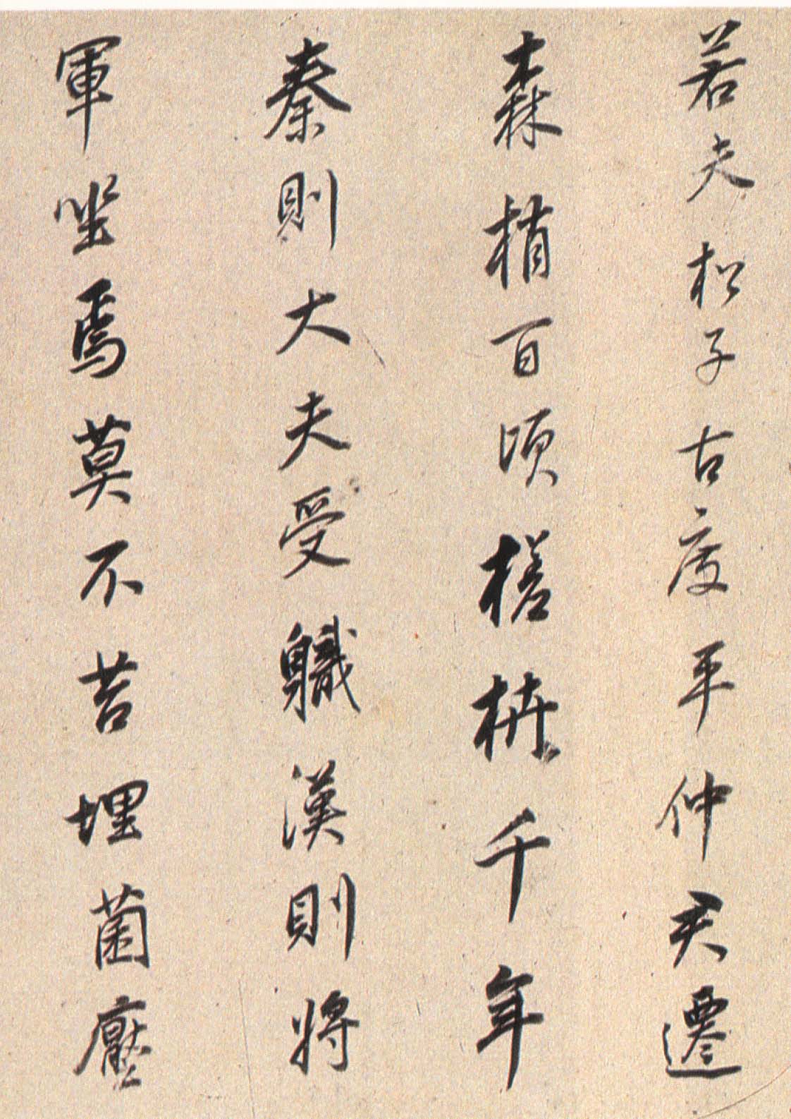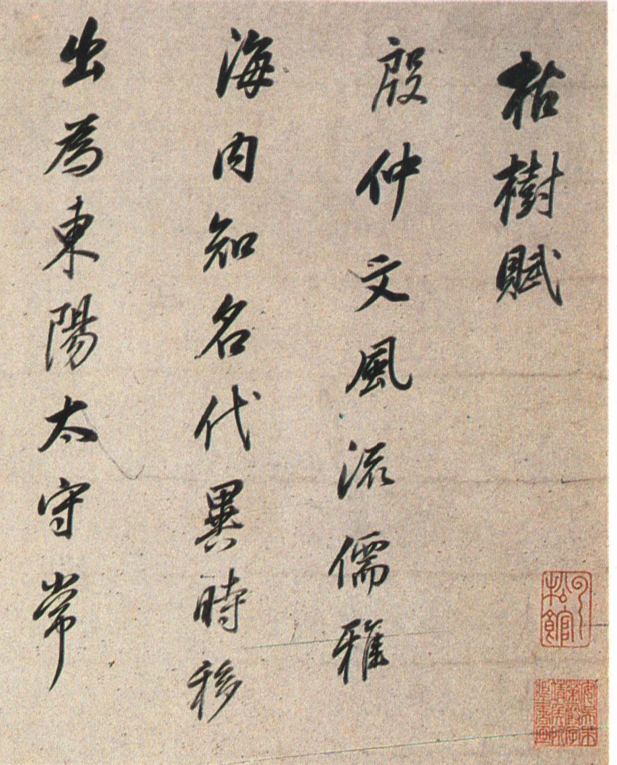 《枯树赋》是南北朝时期文学家庾信羁留北方时所写,以枯树自喻,抒发亡国之痛、故乡之思、羁旅之恨和身世之感。唐褚遂良于贞观四年(六三〇)为燕国公于志宁书此册,墨迹久佚,仅有拓本传世,董其昌《戏鸿堂帖》有收录。《董其昌临枯树赋》,纸本行书,高二十七厘米,长三百六十五厘米,为董氏八十岁时所书,现藏朵云轩。此帖以李北海法写褚,老辣的行笔当中不乏恬静淡然之气,是董其昌行书代表作。