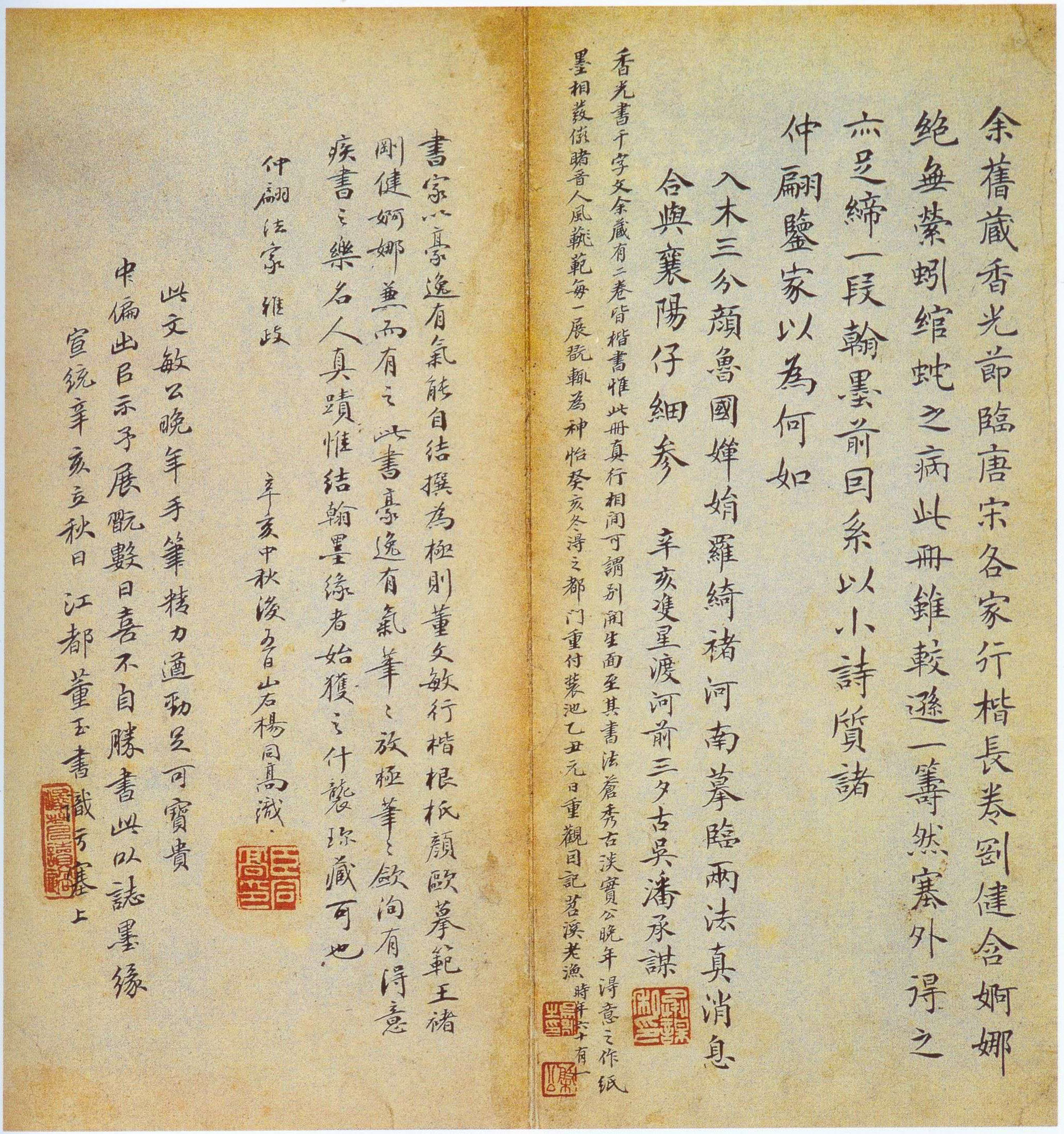 南京博物院藏此卷《行楷书千字文》为董其昌晚年所书,充分体现出董其昌在小楷书、行楷书方面的成就。他说:“吾书无所不临仿,最得意在小楷书,而懒于拈笔,但以行草行世。亦多非作意书,第率尔酬应耳。若使当其合处,便不能追踪晋、魏,断不在唐人后乘也。”(《容台别集》卷二)“(吾书)与赵文敏较,各有短长。行间茂密,千字一同,吾不如赵。若临仿历代,赵得其十一,吾得其十七。又赵书因熟得俗态,吾书因生得秀色。赵书无弗作意,吾书往往率意。当吾作意,赵书亦输一筹。第作意者少耳。”(同上)“晋人书取韵,唐人书取法,宋人书取意。”(董其昌《画禅室随笔》)按照董其昌的自述,“吾书无所不临仿,最得意在小楷书”,尤其小楷书,董其昌自认为最为得意,力追晋魏,超越赵孟頫,“吾书往往率意。当吾作意,赵书亦输一筹”,“吾书因生得秀色”,从而形成了率意自然、生拙古淡的特色。董其昌创造性地将晋、唐、宋的书法审美价值观念和风格特征进行大范畴、主观性地融合、转化,写出了自己的面貌和特色。此卷小行楷千字文,确实从中反映出董其昌楷书的主张、观点和看法。