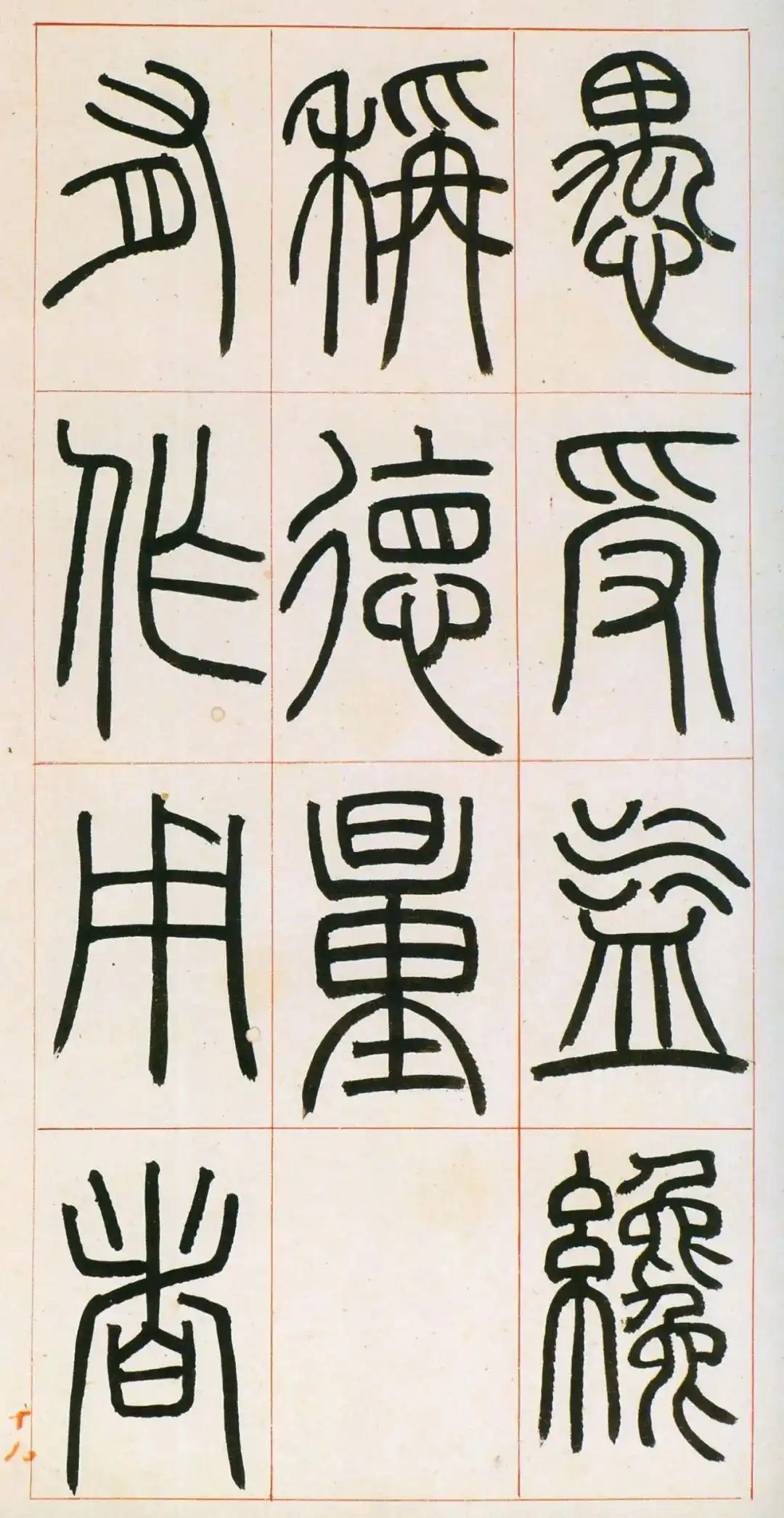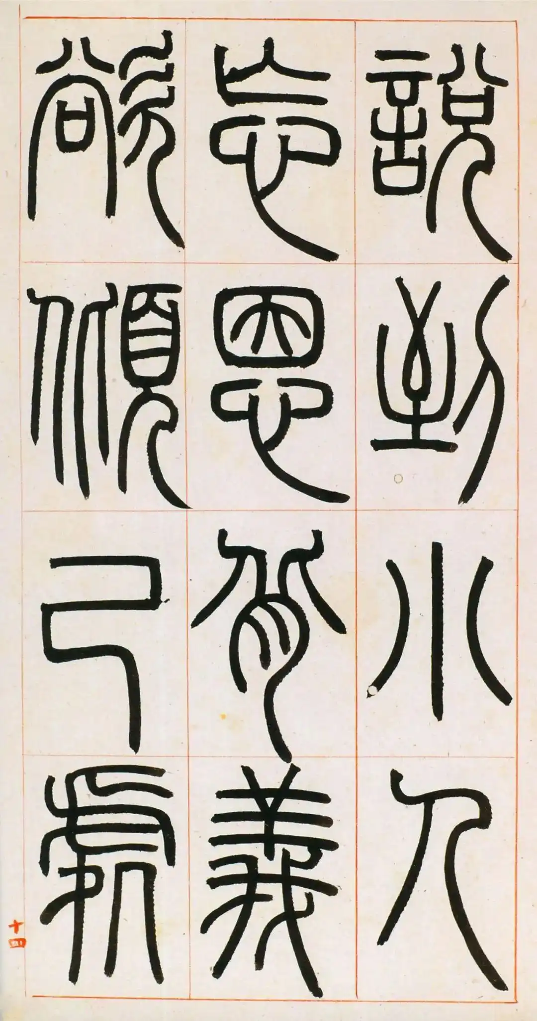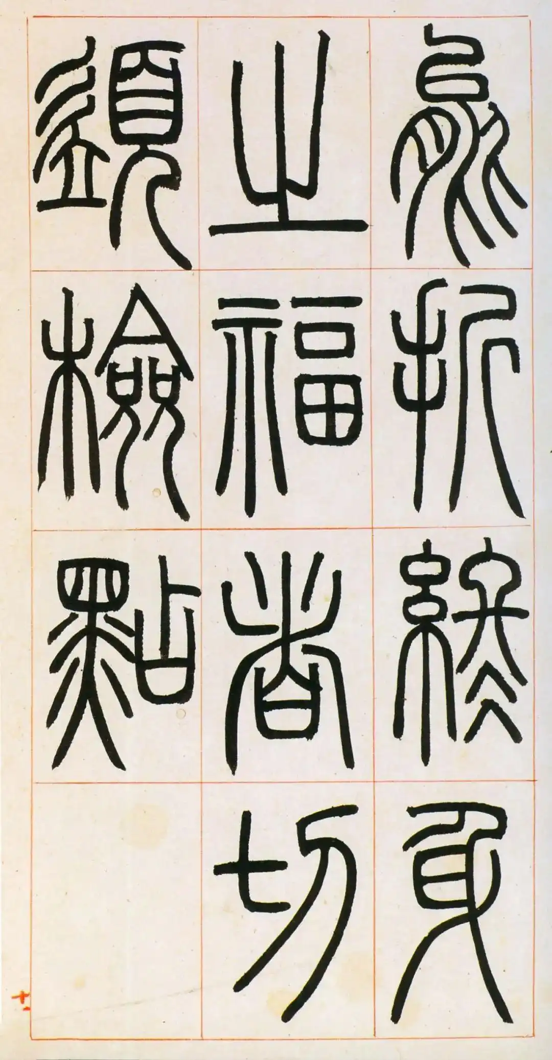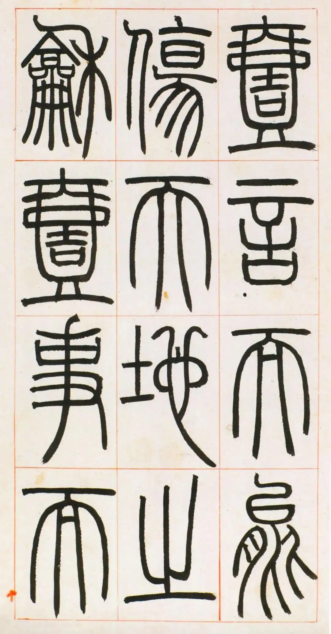 在《八闼册》中,线条转折处偶见方笔,如一些字,既保留了篆书的婉转流畅,又增添了隶书的刚健朴拙。这种“以隶作篆”的手法,打破了篆书千年来的单一笔法体系。