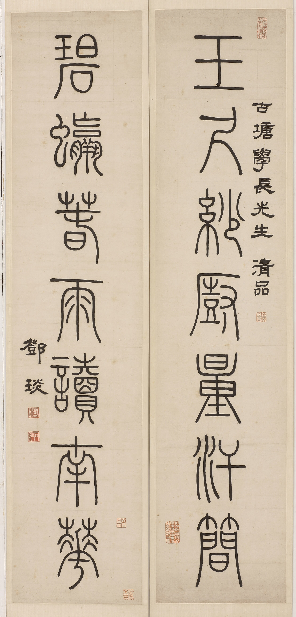 释文:玉尺纱厨量汗简 碧螺春雨读南华 款识:古塘学长先生 清品。邓琰。 【资料参考】无锡博物院网站 《中国书法全集.邓石如卷》(荣宝斋出版) 《邓石如书法篆刻全集》(天津人民美术出版社)