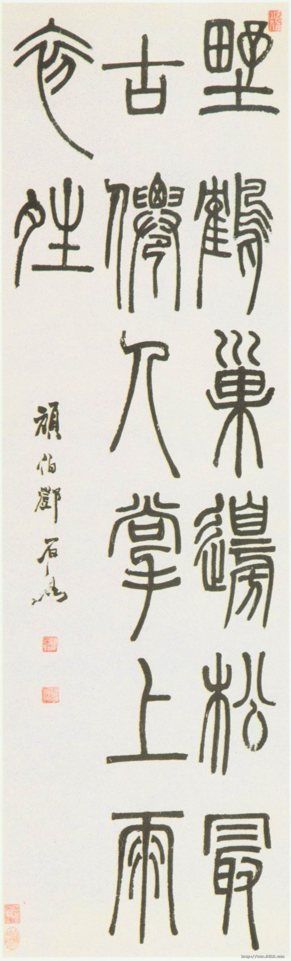 此轴用笔灵活,同“二李”的篆书有明显区别,不再是那种粗细一致,结构严整的“铁线篆”,"玉箸篆",结构疏朗,刚而不火、静而不板,笔力千钧,具有阳刚之美,是一件不可多得的邓氏佳作。