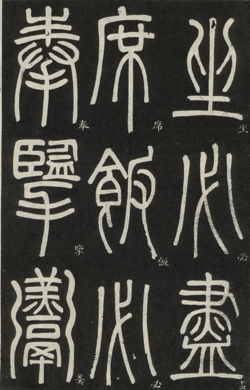 【释文】弟子职。先生施教,弟子是则。温恭自虚,所受是极。见善从之,闻义则服。温柔孝弟,毋骄恃力。志无虚邪,行必正直。游居有常,必就有德。颜色齐,中心必式。夙兴夜寐,衣带衣带必饰;朝益暮习,小心翼翼。一此不解,是谓学则。少者之事,夜寐早作,既拚盥漱,执事有恪。摄衣共盥,先生乃作。沃盥彻盥,豚拚正席,先生乃坐。出入恭敬,如见宾客。危坐乡师,颜色毋怍。 受业之纪,必由长始;一周则然,其余则否。始诵必作,其次则已。凡言与行,思中以为纪。古之将兴者,必由此始。后至就席,狭坐则起。若有宾客,弟子骏作。对客无让,应且遂行,趋进受命。所求虽不在,必以反命。反坐复业。若有所疑,奉手问之。师出皆起。 至于食时,先生将食,弟子馔馈。摄衽盥漱,跪坐而馈。置酱错食,陈膳毋悖。凡置彼食:鸟兽鱼鳖,必先菜羹。羹胾中别,胾在酱前,其设要方。饭是为卒,左酒右酱。告具而退,奉手而立。三饭二斗,左执虚豆,右执挟匕,周还而贰,唯嗛之视。同嗛以齿,周则有始,柄尺不跪,是谓贰纪。先生已食,弟子乃彻。趋走进漱,拚前敛祭。 先生有命,弟子乃食,以齿相要,坐必尽席。饭必奉揽,羹不以手。亦有据膝,毋有隐肘。既食乃饱,循咡覆手,振衽扫席。已食者作,抠衣而降。旋而乡席,各彻其馈,如于宾客。既彻并器,乃还而立。 凡拚之道:实水于盘,攘臂袂及肘,堂上则播洒,室中握手。执箕膺揲,厥中有帚。入户而立,其仪不忒。执帚下箕,倚于户侧。凡拚之纪,必由奥始。俯仰磐折,拚毋有彻。拚前而退,聚于户内。坐板排之,以叶适己,实帚于箕。先生若作,乃兴而辞。坐执而立,遂出弃之。既拚反立,是协是稽。暮食复礼。 昏将举火,执烛隅坐。错总之法,横于坐所。栉之远近,乃承厥火。居句如矩,蒸间容蒸。然者处下,奉椀以为绪。右手执烛,左手正栉。有堕代烛,交坐毋倍尊者。乃取厥栉,遂出是去。先生将息,弟子皆起。敬奉枕席,问所何趾;俶衽则请,有常则否。先生既息,各就其友。相切相磋,各长其仪。周则复始,是谓弟子之纪。嘉庆龙飞九年,岁在焉逢困敦十有一月,丙戌朔粤十有八日癸卯,古皖邓石如篆于辨志书塾。