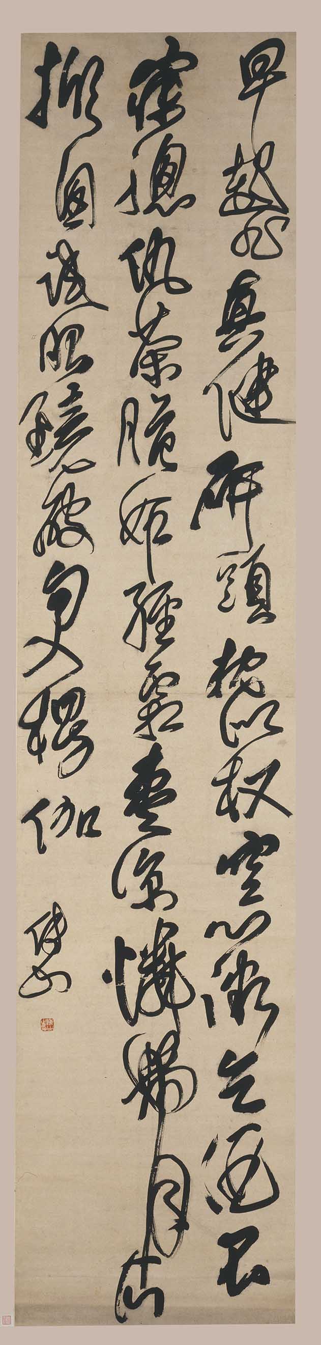 傅山的草书正是在王铎草书的基础上,加以发挥,渐渐形成自己的风格。他在书法上有一段著名的论断:“宁拙毋巧,宁丑毋媚,宁支离毋轻滑,宁真率毋安排。”此件草书轴为其代表风格,