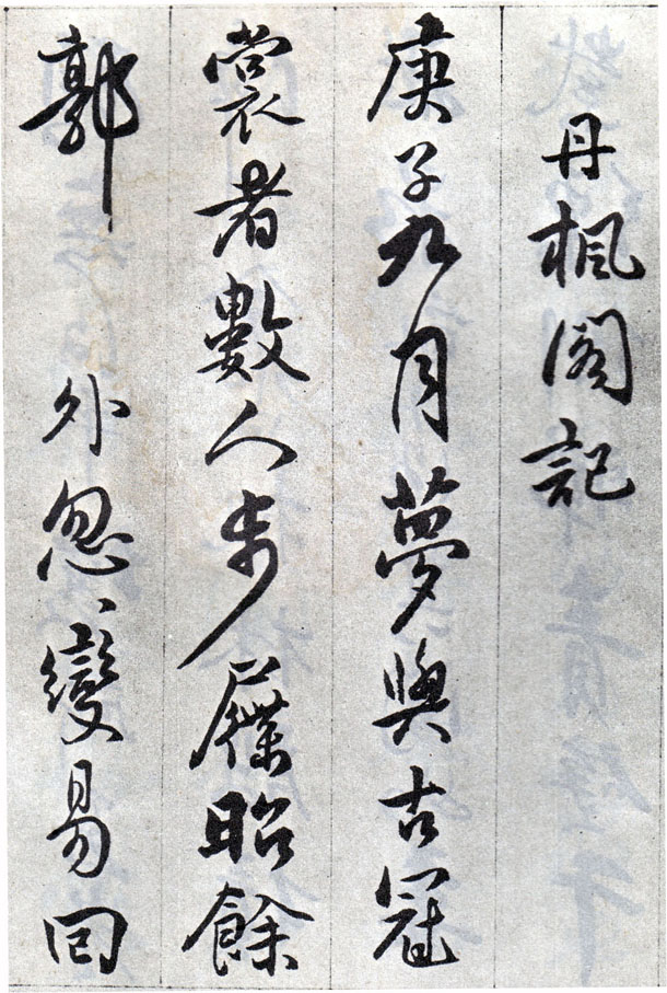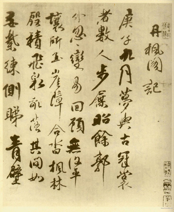 釋文:丹楓閣記。庚子九月,夢與古冠裳者數人,步屦昭餘郭外。忽忽變易,回顧無復平壤,所至崖障合沓,楓林殷積,飛泉亂落其間,如委紫練,侧睇青壁,千仞如削,目致為窮也。其上長松密舉,而松末擁一閣,摇摇如一巢焉,顏曰丹楓,非篆非隸,嵌空一窗,億當閣逕,而蛛絲荒織,扃若終古矣。俄爾風水合住,塊然偃卧。遂經始閣材,構如其夢。莊