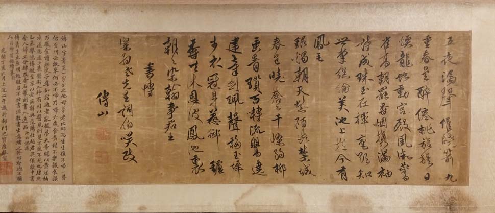 傅山《行书杜甫和贾舍人早朝诗、贾舍人早朝大明宫诗》绫本 24×64.7cm 广州艺术博物院藏