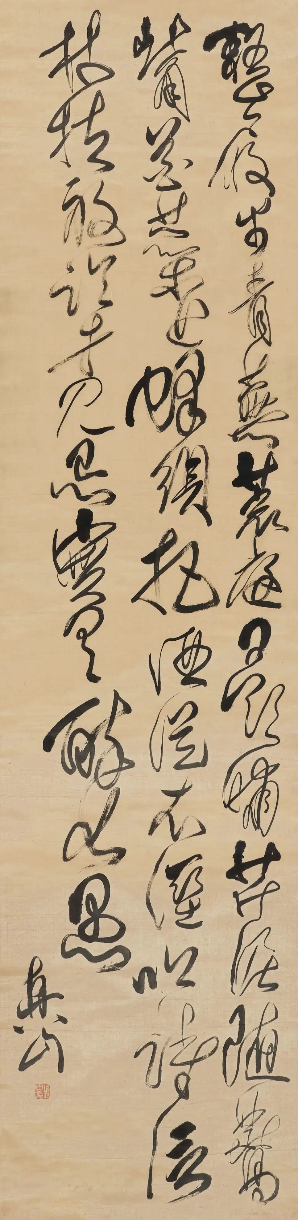 本立轴为水墨绫本,高206厘米,宽51厘米。是傅山录唐代诗圣杜甫的一首五言诗《徐步》,未署年款,具体书写时间不详,款落:“真山”,下钤有“傅山印”。从书风判断,当属傅山中晚期作品。本作书法振笔疾书,气韵连贯,纵逸奇宕,潇洒奇逸,如江河之势一泻千里,气势豪迈。用笔中仿佛有着某种生拙的气息,然而其用笔又在法度之中。缠绕游丝的强调,使字与字,笔划与笔划间的疏密空间对比格外鲜明。其间点画圆润,大气凛然,浓墨重笔,笔笔蕴含千钧之力等艺术手法,在傅山的手下运用得十分娴熟,仿佛均在不经意中,真率的情感、大起大落的章法,充分表现了他博大精深的胸怀。章法安排别具新意,字距、行距大小疏密参差有致,错综开合,于变化中见统一,将书法境界与杜甫之诗达到内容与形式的统一,足见其性情与功力。