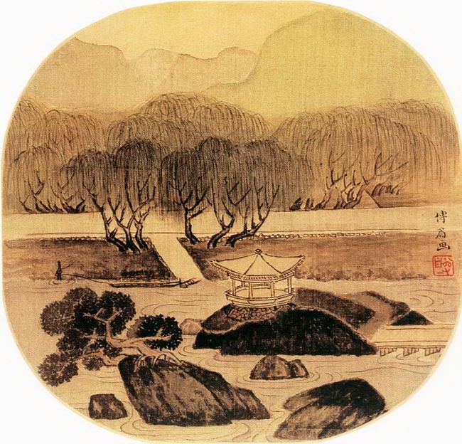 此图苍秀古润,意趣盎然。水潭石丘上绘一园亭,略有装饰意味,稚拙古雅。水有波纹流动之势,似潺潺有声。中景垂柳,株干枝条茂密,郁郁森森,傅绿柳成荫之神。