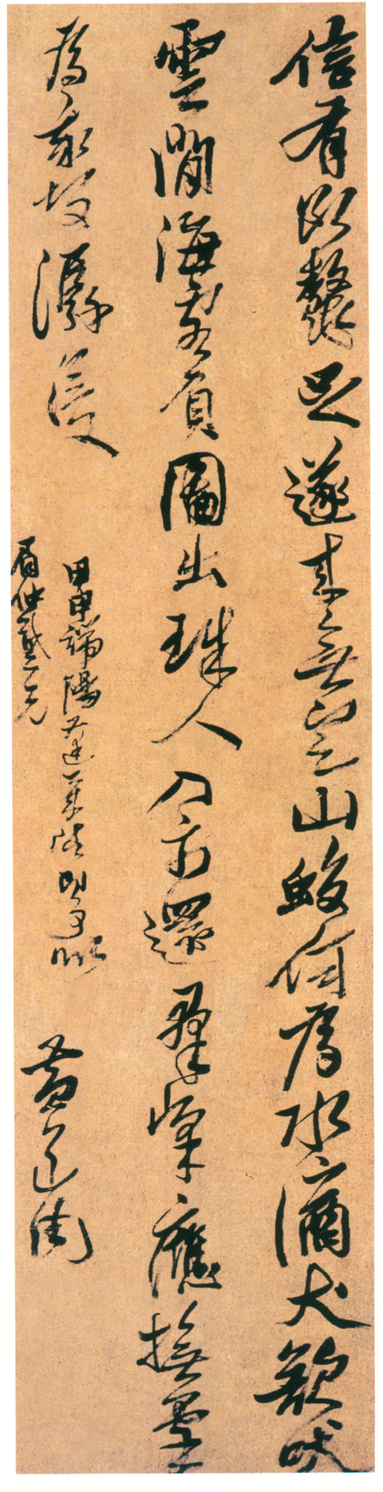 黄道周《赠眉仲戴蓬莱即事诗轴》绢本行书 192.5×49.5cm 崇祯十七年(1644)北京故宫博物院藏 释文:信有断鳌足,遂来无定山。蛟何为水氵裔,犬欲吠雲间。海客负图出,珠人入示还。群峰应抚掌,为我故潺湲。甲申端阳蓬莱赋即事似眉仲戴兄。黄道周。