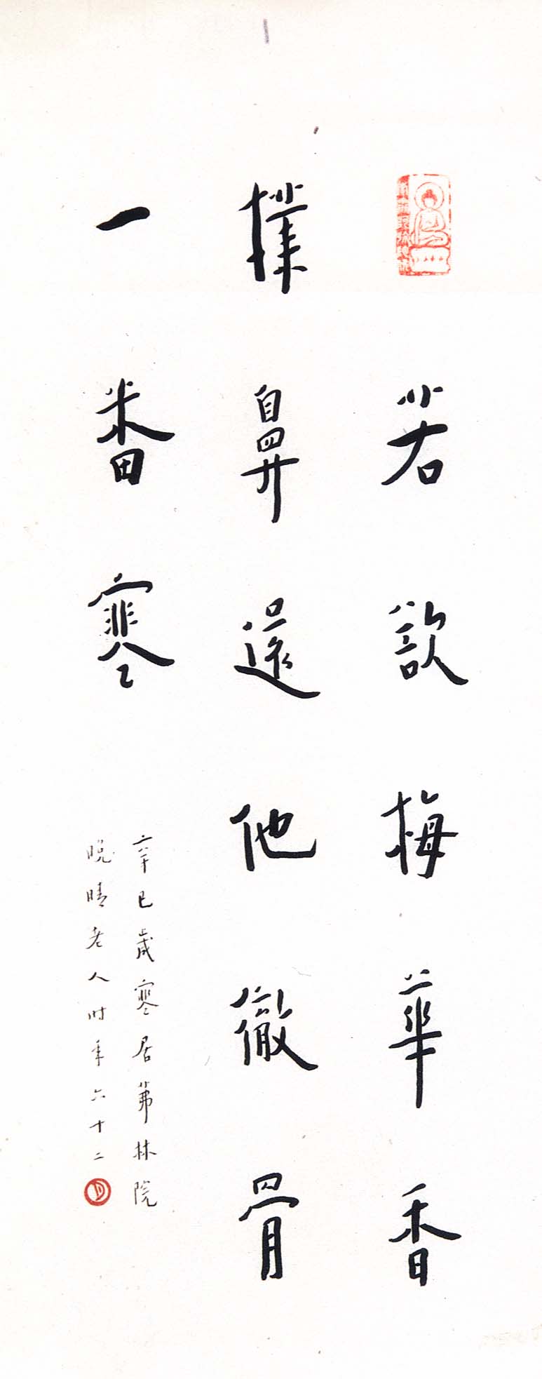 此联句应出自宋 诗人释惟一的《偈颂一百三十六首》: 可祖齐腰立雪,长庆坐破蒲团。 一人铁壁觑要透,一人沧海沥须乾。 铁壁透,沧海乾,出礼三拜依位立, 卷起帘来天下宽。堪悲堪笑,何易何难。 信道梅花香扑鼻,须是彻骨一番寒。 款署:辛巳岁寒居茀林院,晚晴老人时年六十二。 钤印:月
