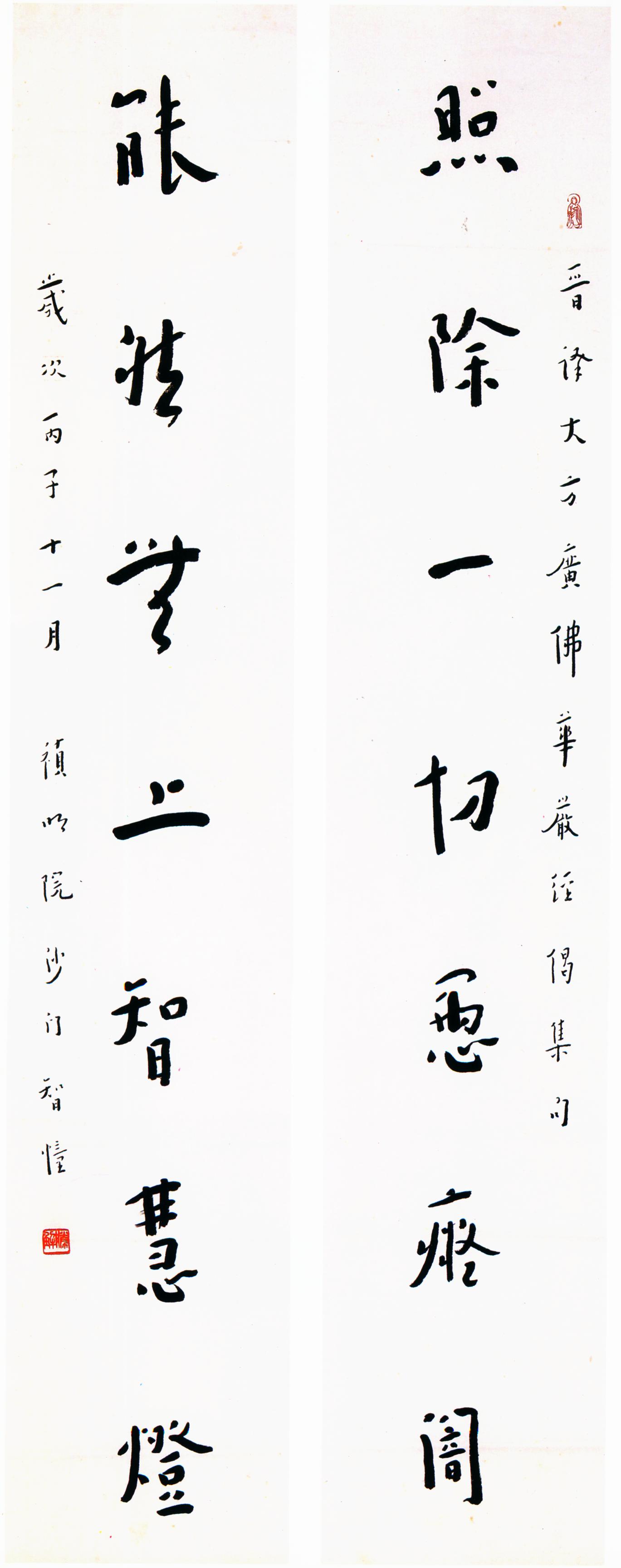 释文:照除一切愚痴闇,能然无上智慧灯。——晋译大方广佛华严经偈集句。岁次丙子十一月,祯明院沙门慧憧。
