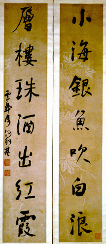 此幅的聯文:「小海銀魚吹白浪,層樓珠酒出紅霞」,充滿了愜意之趣。何紹基的行書,用中鋒筆,微有顫動之勢;字常不為繩墨所拘,有著從容閒適的感覺,並時有欹斜之態,本幅正為典型的代表作之一。