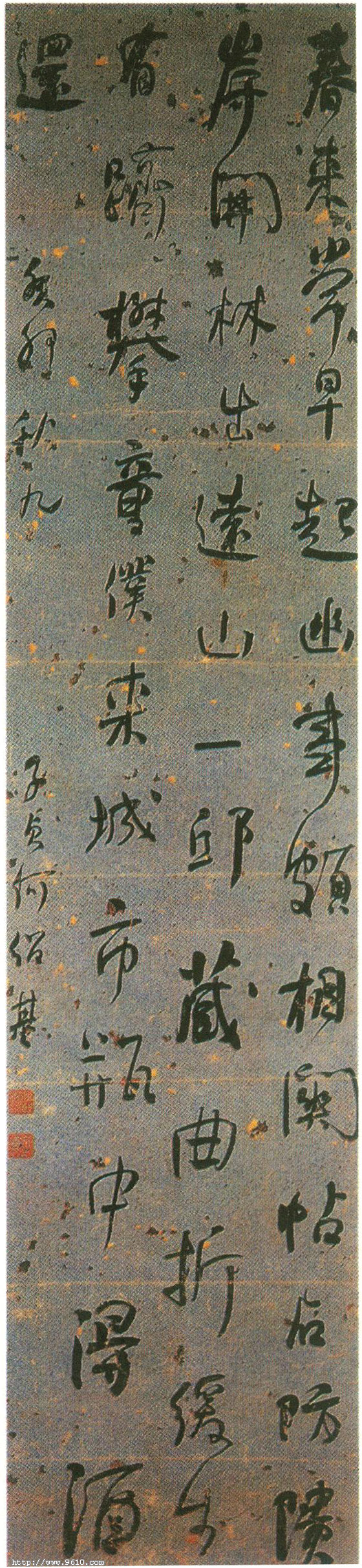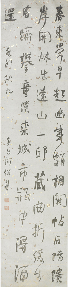 何绍基《行书杜甫早起五言诗轴》 169.3×39.5cm 首都博物馆藏 释文:春来常早起,幽事颇相关。帖石防隤岸,开林出远山。 一丘藏曲折,缓步有跻攀。童仆来城市,瓶中得酒还。癸卯秋九,子贞何绍基。