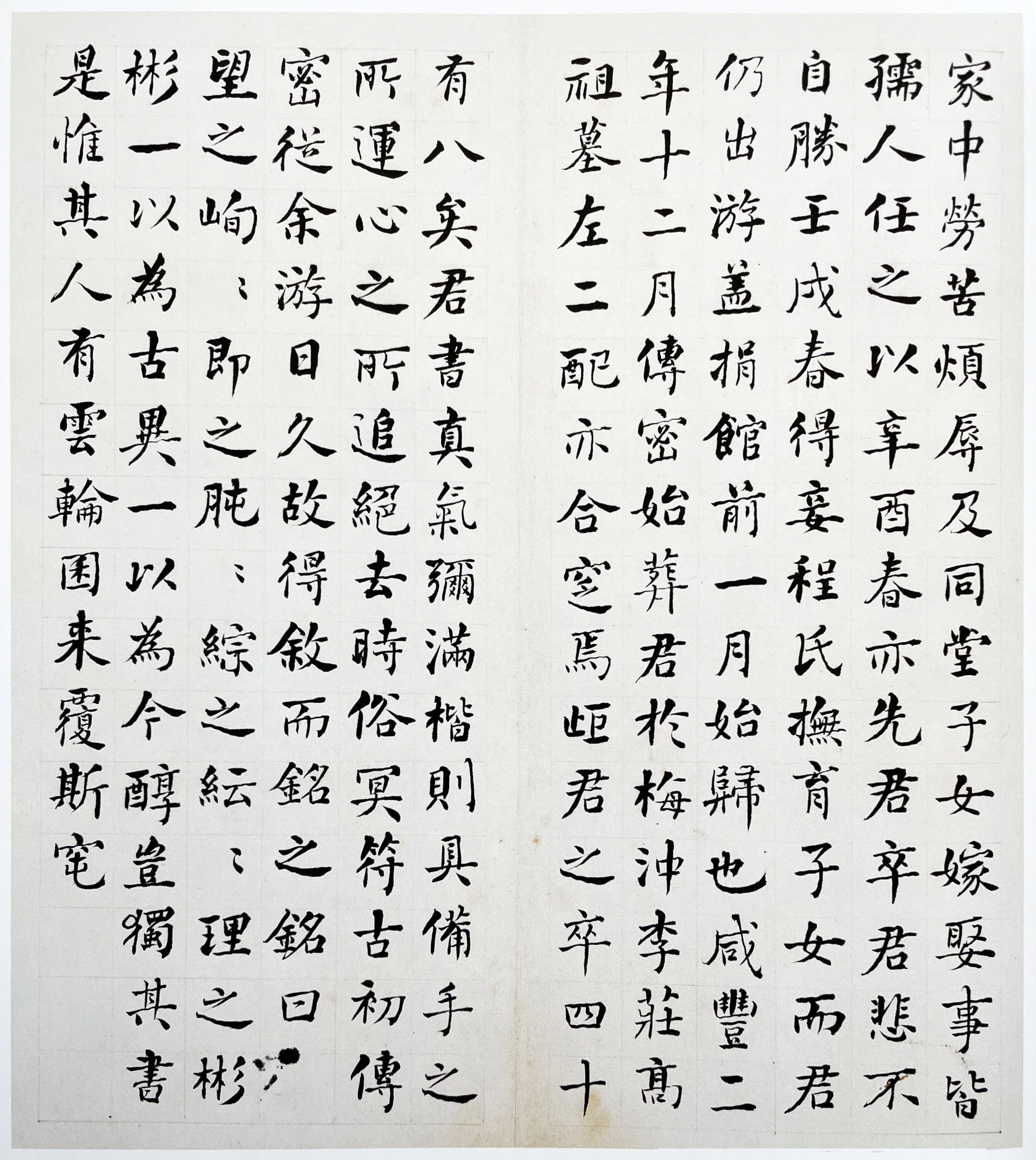 释文:家中劳苦繁辱及同堂子女嫁娶事,皆孺人任之。以辛酉春,亦先君卒。君悲不自胜。壬戌春,得妾程氏,抚育子女,而君仍出游,盖捐馆前一日始归也。咸丰二年十二月,传密始葬君于梅冲李庄高祖墓左,二配亦合窆焉。距君之卒四十有八矣。君书真气弥满,楷则具备手之所运心之所追,绝去时俗,符古初。传密从余游,日久,故得叙而铭之,曰: 望之峋峋,即之肫肫。综之纭纭,理之彬彬。一以为古,异一为今。醇岂独其书,是惟其人有云轮囷来覆斯窀。