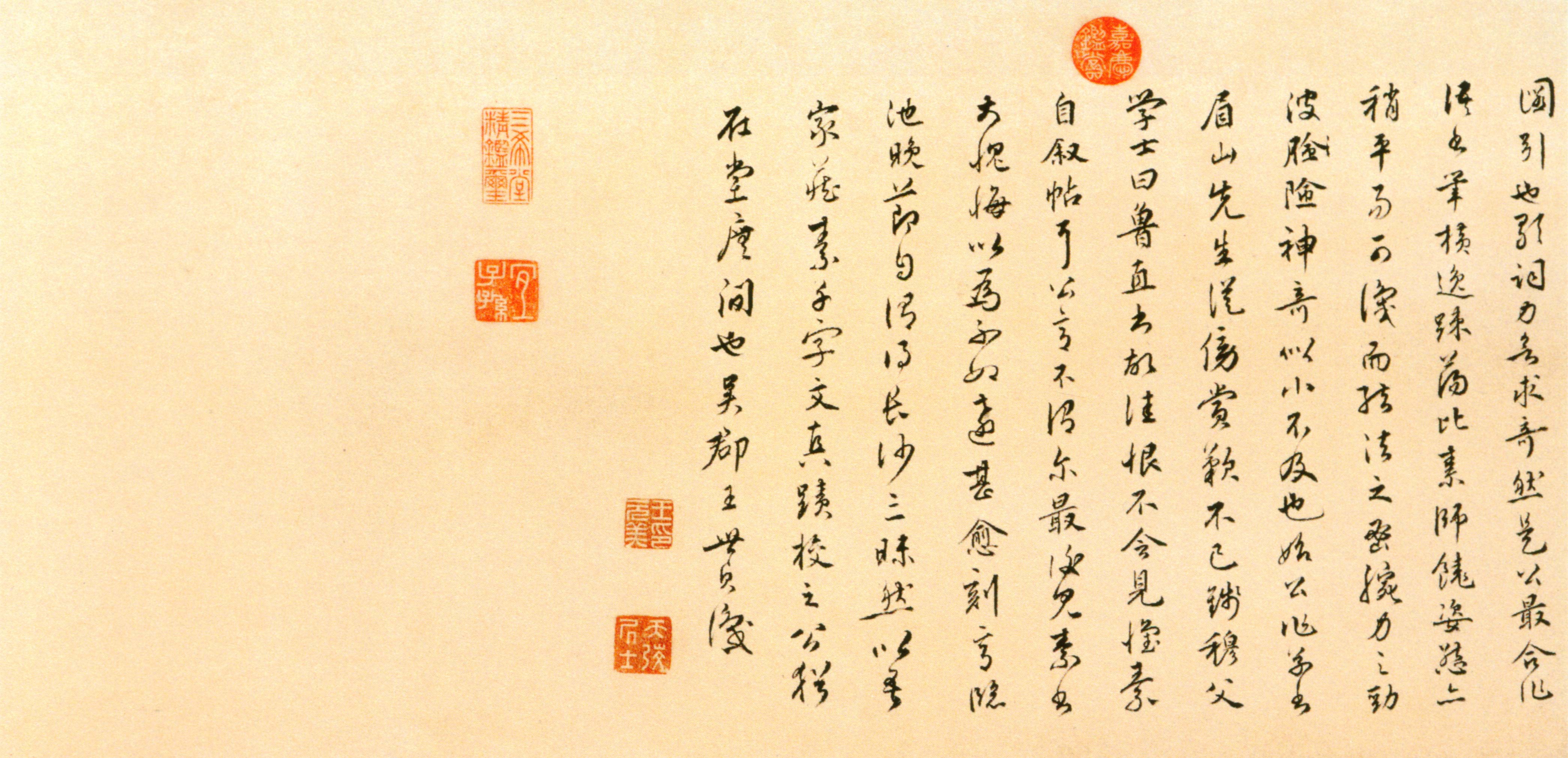 鉴藏印有“绍兴”、“内府书印”、“贞元”、“乾坤清赏”、“石渠宝笈”、“宝笈三编”、“有明王氏图书之印”及清嘉庆内府诸印等。卷后有明吴宽、王世贞跋。