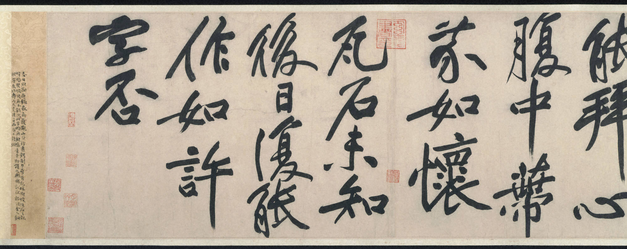 黄庭坚擅行、草二体,书法结字中宫收紧,而四面呈放射状,笔画长枪大戟,筋脉舒展,锋芒外露,骨力特健,此卷被认为是黄贬谪时期的杰作。钤有“绍兴”、“內府书印”等印记,后面有王铎、吴宽、李东阳等题跋,曾经徐俊卿、周湘云、张大千等收藏。后美国收藏家John B.Elliott(艾略特)在方闻教授的指导下,从香港购入张大千旧藏此卷,现寄存于普林斯顿大学艺术博物馆中。