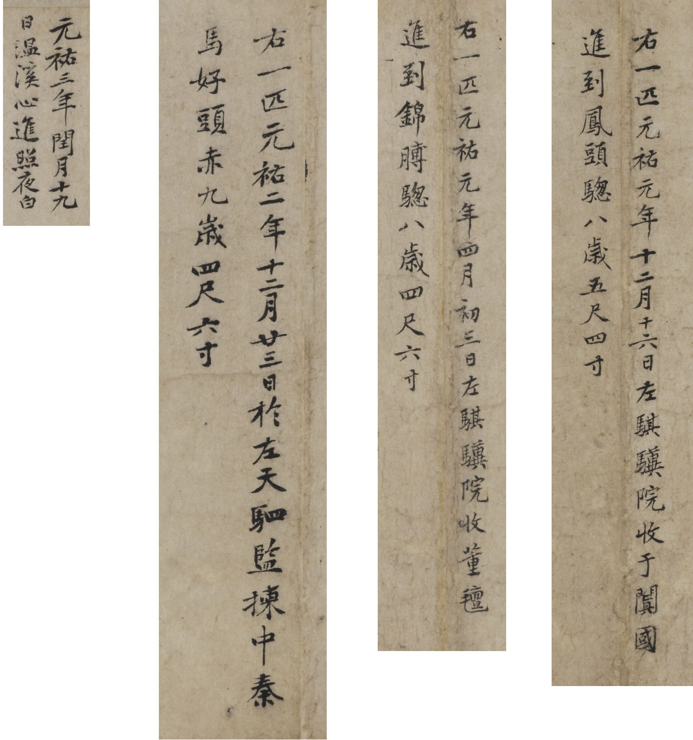 右一匹,元祐元年四月初三日左骐骥院收,董毡进到锦膊騘,八岁四尺六寸。