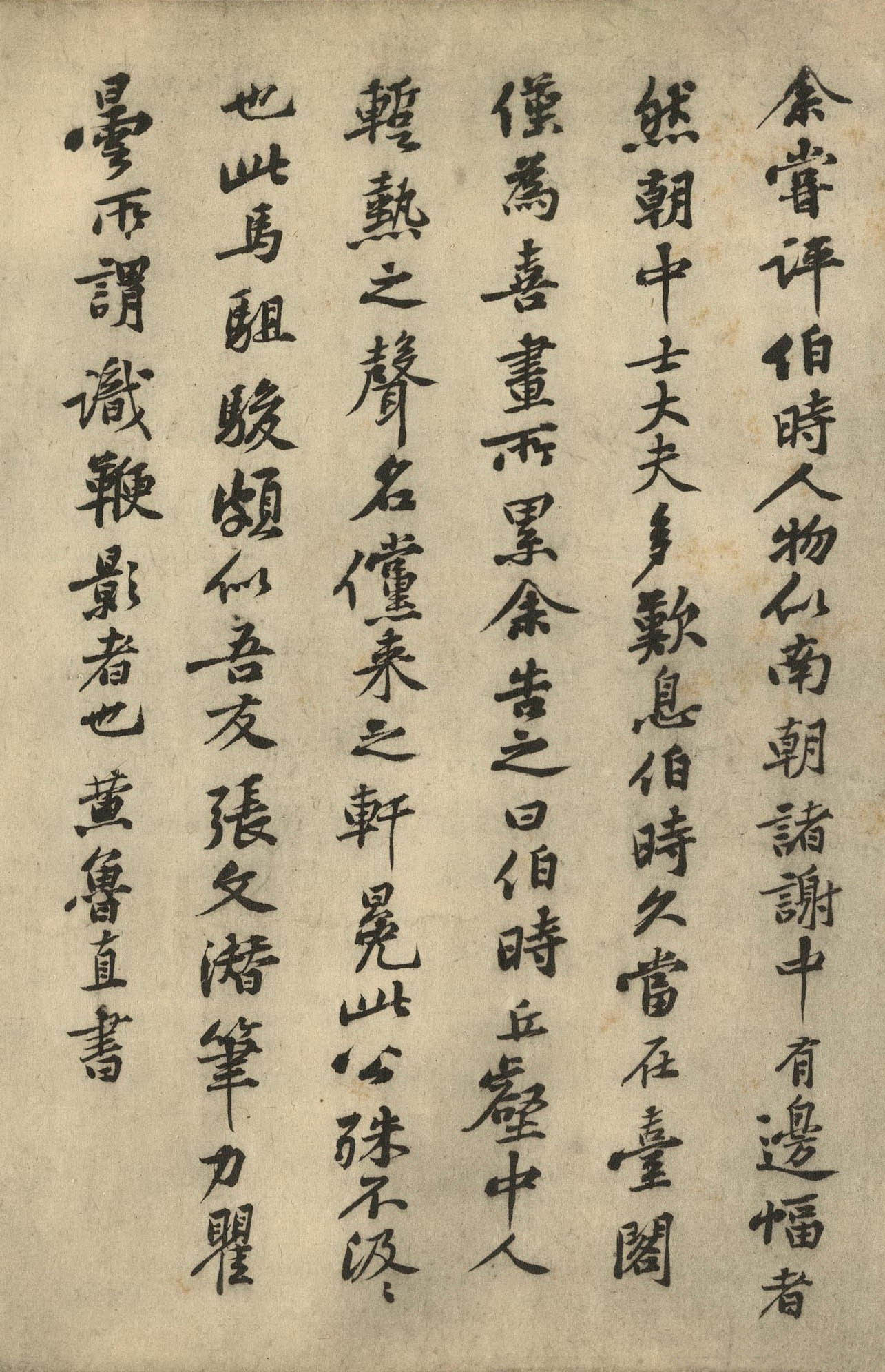 释文: 余尝评伯时人物似南朝诸谢中有边幅者,然中朝士大夫多叹息伯时当在台阁,仅为善画所累。余告之曰:‘伯时丘壑中人,暂热之声名,傥来之轩冕,殊不汲汲也。殊不汲汲也。此马驵骏,颇似吾友张文潜笔力,瞿昙所为识鞭影者也。黄鲁直书。