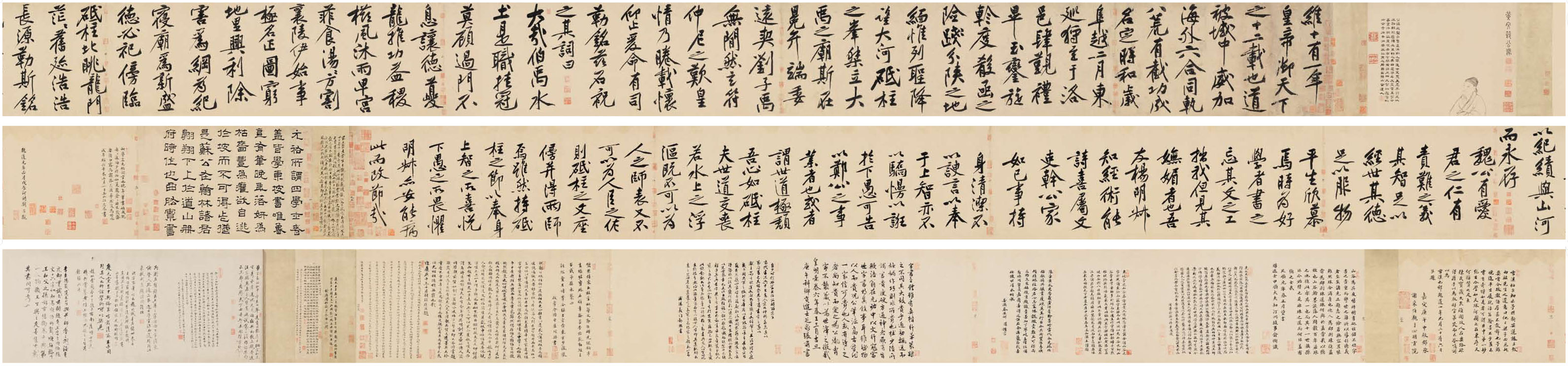 《砥柱铭》,行书。录唐代魏征《砥柱铭》,此卷长8.24米,共计82行407字,加上历代题跋,总长近15米。仅次于现藏于美国的18.22米草书《廉颇蔺相如列传》卷和藏于台北故宫的10米长大行楷《明瓒诗卷后跋》,比著名的《伏波帖》(8.20米)、《诸上座帖》(7.29米)还长。
