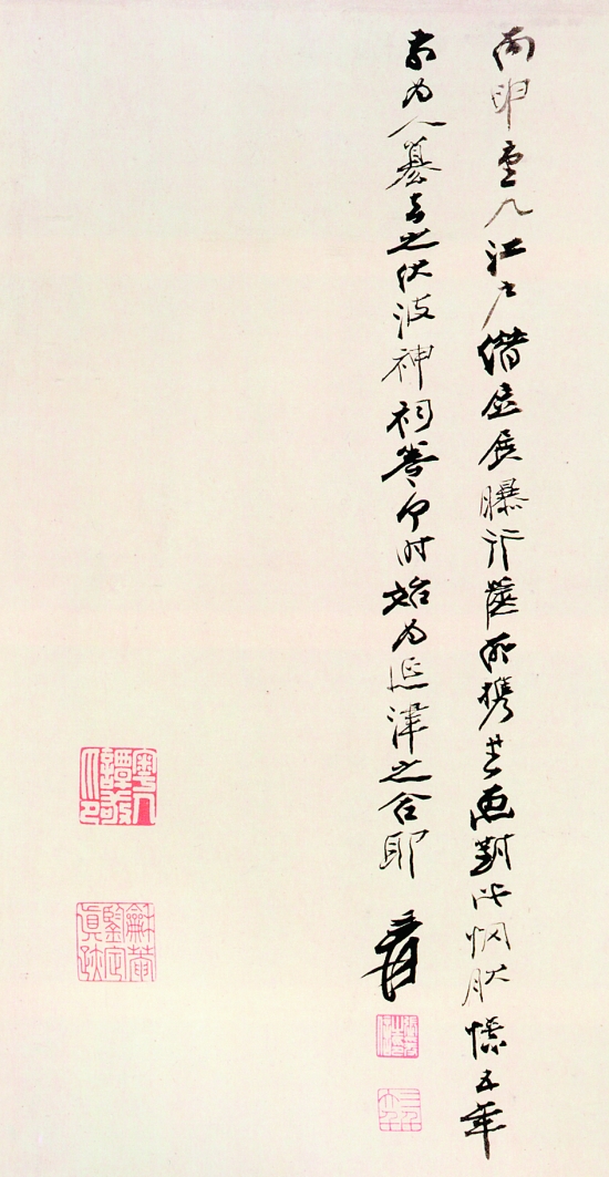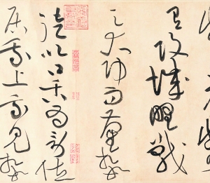 再看黄庭坚本人对书法的体悟:“大抵书字欲如人有精神,细观之则部伍皆中度耳。”(《山谷集别集》卷六)“凡书之害,姿媚是其小疵,轻佻是其大病,直欲落笔一一端正,至于放笔自然成行。草则虽草而笔意端正,最忌用意装缀,便不成书。”(《山谷老人刀笔》卷四)“书字楷法如快马斫阵,草法如左规右矩,此古人妙处。”(同上,卷二十)“张长史行草帖多出于赝作。人闻张颠,未尝见其笔墨,遂妄作狂蹶之书,托之长史。其实张公姿性颠逸,其书字字入法度中也。”(《豫章黄先生文集》卷二十八)可见黄庭坚对书法尤其是草书的观念标准颇与后人对他的评价相合——韵高格清,弃绝媚俗。黄庭坚草书表现为纵横跌宕变化多端,但重法度守规矩,“驰不失范”,绝不随心所欲以至失笔失态丑陋乖谬。