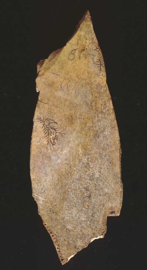 本版甲骨上刻鸟形象形文字。由上而下是由鸟嘴、鸟头、鸟身进而全部鸟形的刻画过程。这是稀有的例子。
