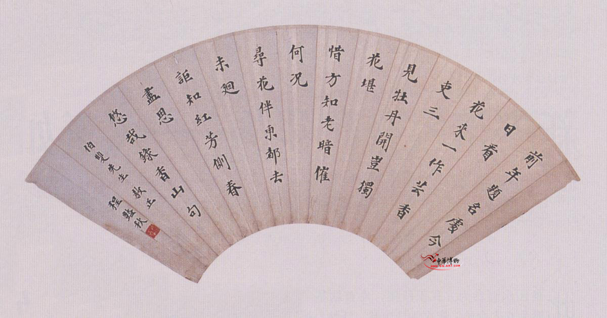 此为程砚秋的“楷书扇面”,落款“程艳秋”,应书于1932年他改名砚秋之前。连提款共15行,楷书书录了白居易的诗句。行间有的6字,有的两字,布局疏朗,字迹刚健,一丝不苟,蕴含着静静的书卷气。虽然历经70余年岁月,纸色已泛黄,浸染了水渍,却不减艺术的神采,清晰可见这位京剧艺术大师书法上的个性和不凡造诣。