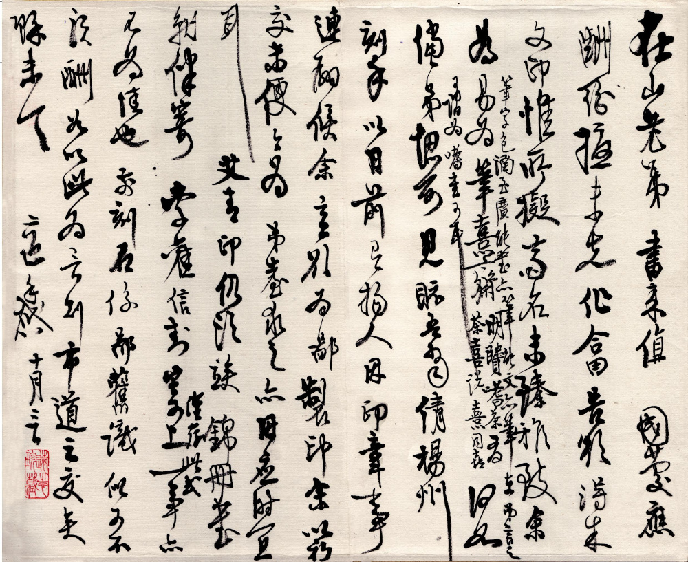 释文:在山老弟:书来值国庆,应酬纷扰,未克作答。告欲得朱文印, 惟所拟斋名,未臻雅致。余为易为笔憙斋(笔字包涵至广,能