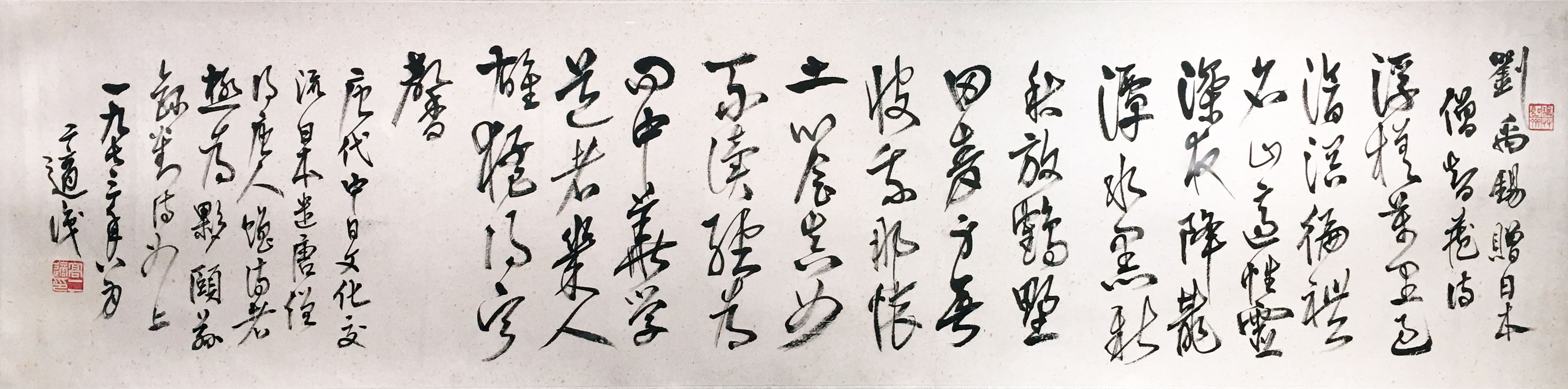 高二适《行书刘禹锡赠日本僧智藏诗》 33.4×137cm 1973年 江苏省美术馆藏 释文:刘禹锡赠日本僧智藏浮槎万里过沧溟,遍礼名山适性灵。 深夜降龙潭水黑,新秋放鹤野田青。 身无彼我那怀土,心会真如不读经。 为问中华学道者,几人雄猛得宁馨。 唐代中日文化交流,日本遣唐僧得唐人赠诗者,极为夥。颐荪录刘诗如上。一九七三年八月,二适识。 钤印:高二适印(白文)、证草圣斋(朱文)