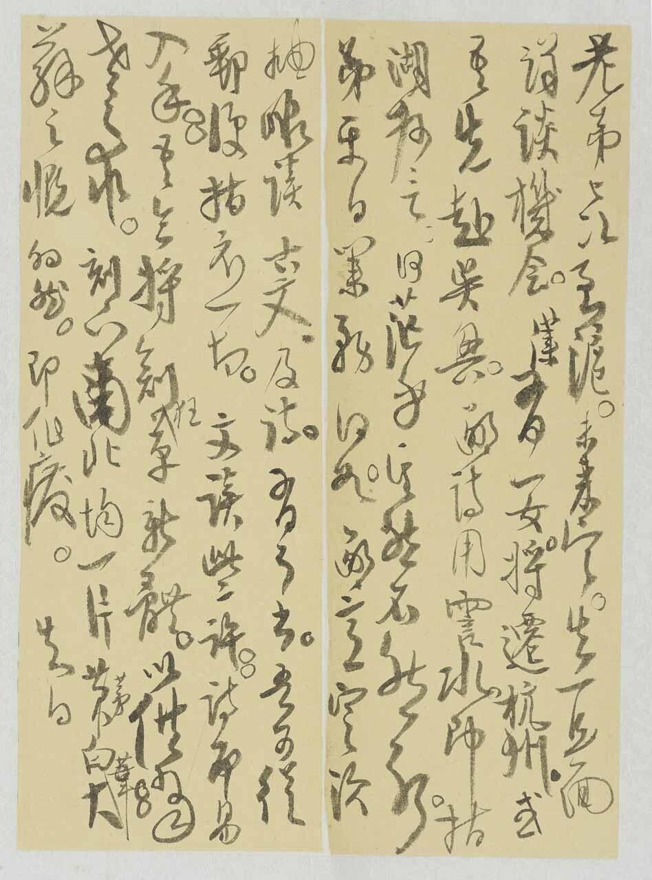 释文:老弟上次到沪,未来宁,失一见面详谈机会。仆有一女将迁杭州,或吾先赴吴兴。鄙诗用霅水,即指湖州言,何茫乎其然不然耶。弟平日业务何如?鄙意定须抽暇读古文、及诗。有了书,吾可以从邮便指示一切。文读些许,诗即易入手。吾今将创狂草新体,以供当世之求。刻下南北均一片黄茅白苇。大苏之慨,的然。即作废。知白 【资料来源】泰州高二适纪念馆藏