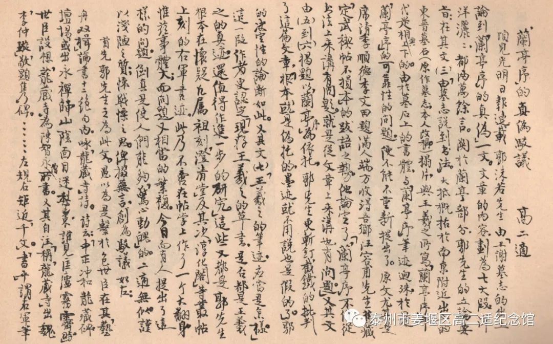 直到二适先生去世以后,我才渐渐弄明白这两点。在二适先生的遗稿中,有一篇《兰亭序真伪之再驳议》,此稿写于1972年,是针对当年郭沫若又一篇文章《新疆新出土的晋人写本<三国志>残卷》的。郭沫若旧话重提,坚持七年前他在兰亭问题上的观点。二适先生的文章有这样一段话:“夫逸少书名之在吾土,大有日月经天,江河行地之势,固无须谁毁与谁誉之。”这不正是“不值一辨”的答案吗? 顺便说一句,如今,这篇《再驳议》手稿,已由高可可等捐赠给求雨山高二适纪念馆,并被定为国家一级文物。