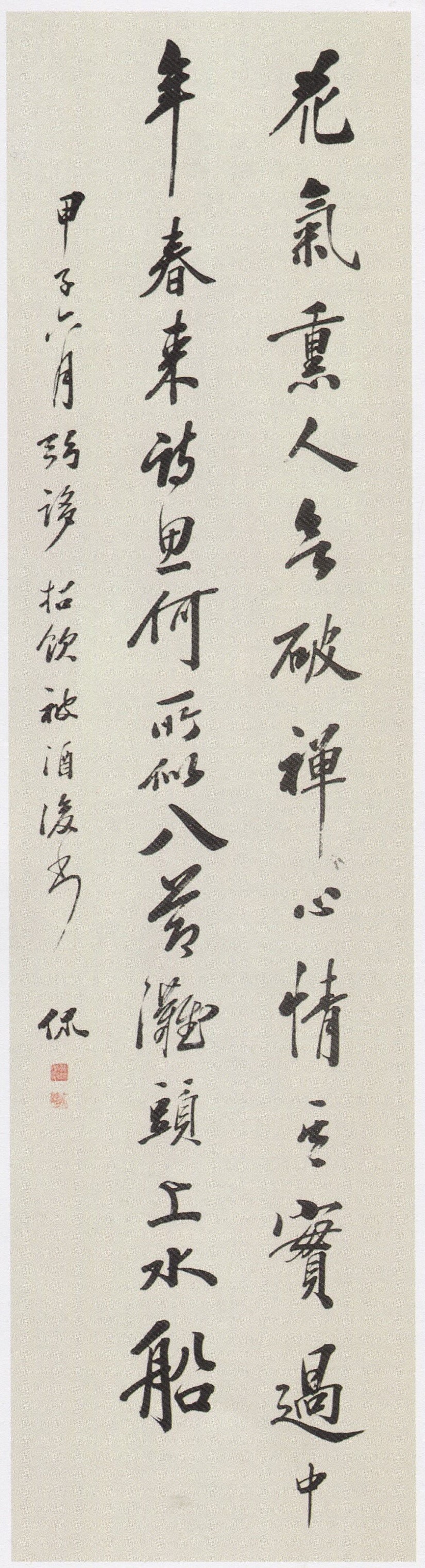 黄侃《行书黄庭坚花气熏人诗轴》 169×47cm 1924年作 湖北省博物馆藏 释文:花气熏人欲破禅,心情其实过中年。春来诗思何所似,八节滩头上水船。 款署:甲子六月,弜誃招饮被酒后书。侃。 钤印:黄侃季刚(白文)、亦陶(朱文) 【资料来源】《书画艺术》杂志2013年第一期