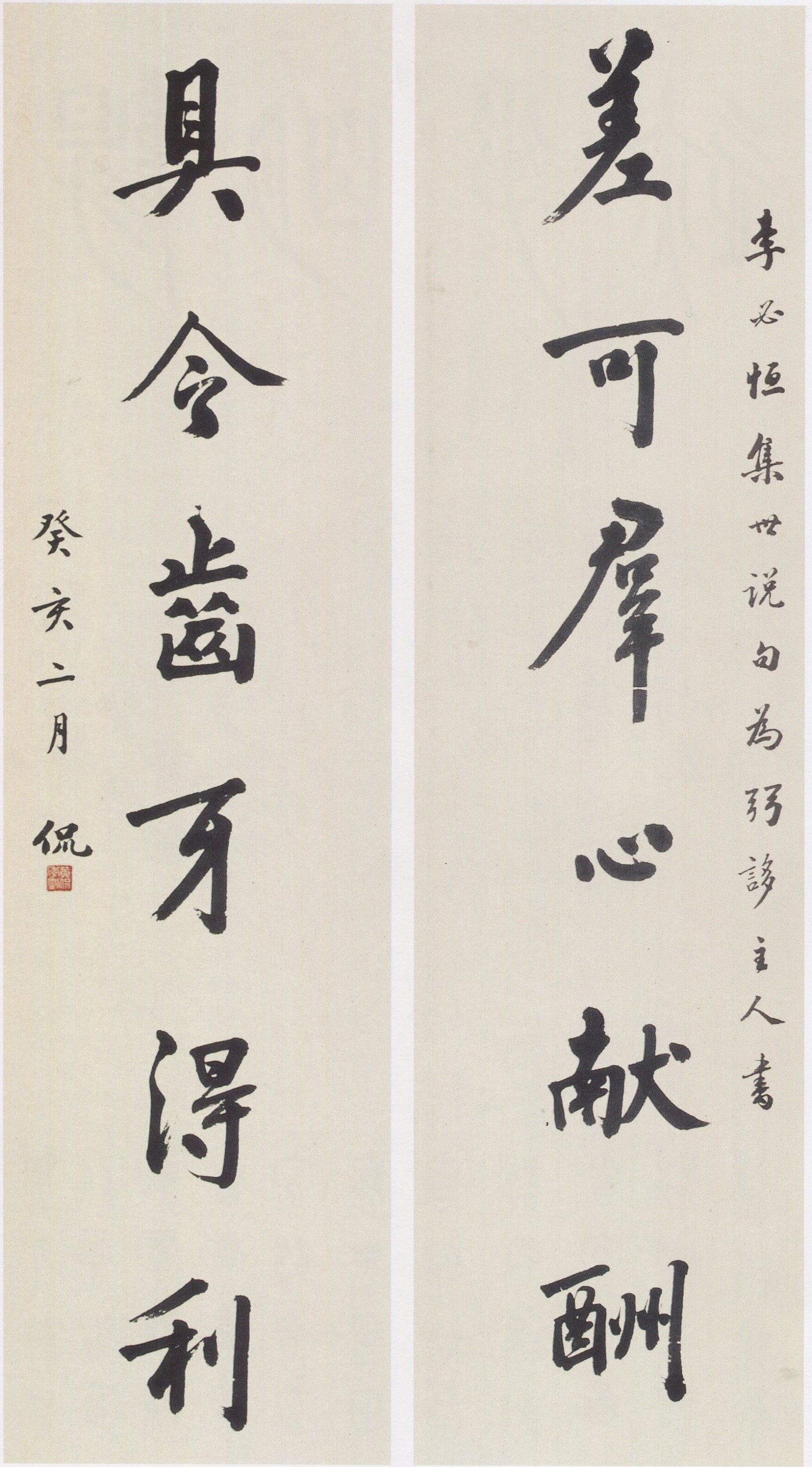 黄侃《行书差可具令六言联》 132.5×31cm×2 1923年 湖北省博物馆藏 释文:差可群心献酬,具令齿牙得利。 款署:李必恒集世说句为弜誃主人书,癸亥二月,黄侃。 钤印:黄侃季刚(白文) 【资料来源】《书画艺术》杂志2013年第一期