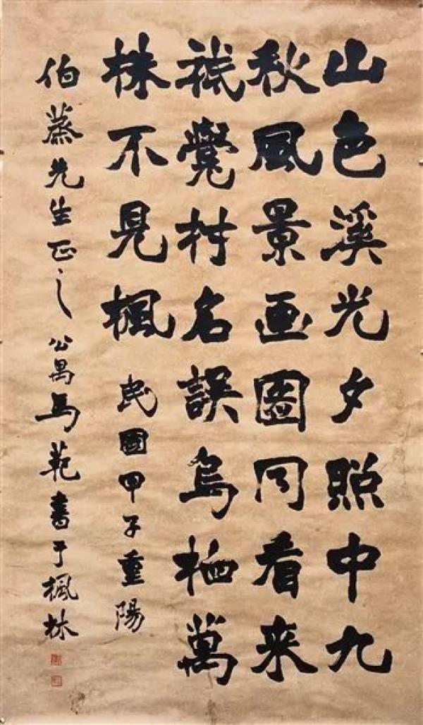 释文:山色溪光夕照中,九秋风景画图同。 看来只觉村名误,乌桕万株不见枫。 款识:民国甲子重阳 伯蒸先生正之 公禺马范书于枫林