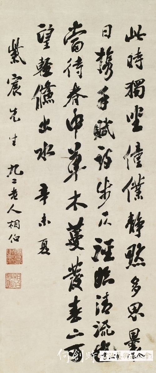 释文:此时独坐,僮僕静默,多思曩日携手赋诗,步仄径,临清流也。当待春中,草木蔓发,春山可望,轻鯈出水。辛未夏。紫宸先生。九二老人相伯。