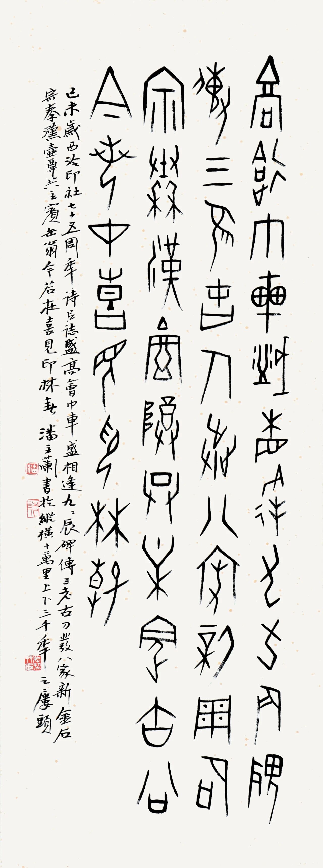 潘主兰《甲骨文贺西泠印社七十五周年诗中堂》 1979年 释文:高会巾车盛,相逢九九辰。碑传三老古,刀发八家新。金石宗秦汉,壶尊共主宾。缶翁今若在,喜见印林春。 款识:己未岁西泠印社七十五周年诗以志盛。“高会巾车盛,相逢九九辰。碑传三老古,刀发八家新。金石宗秦汉,壶尊共主宾。缶翁今若在,喜见印林春。”潘主兰书于纵横十万里上下三千年之楼头。 钤印:潘(白文)诗人(朱文)爰契我龟(白文) 【资料来源】《三山四先生——闽都四家书画展(第二回)》(福州城市客厅——福之轩展厅,2025年10月31日-11月30日)