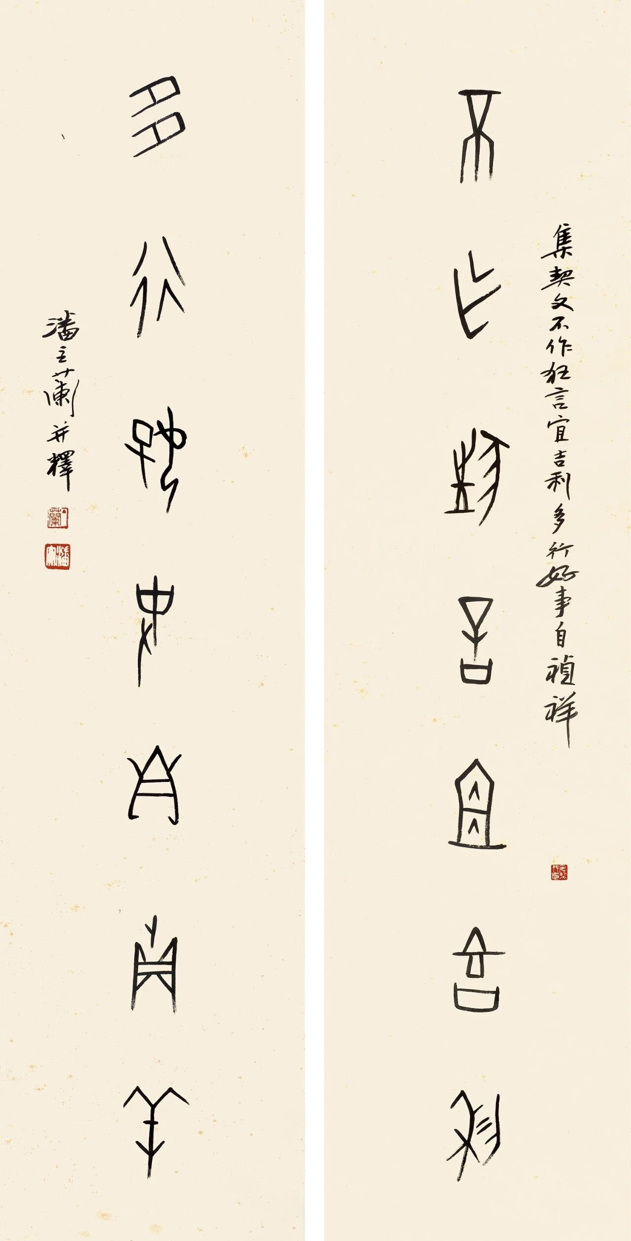 潘主兰《甲骨文不作多行七言联》纸本 134×32.5cm×2 释文:不作狂言宜吉利,多行好事自祯祥。 款识:集契文不作狂言宜吉利,多行好事自祯祥。潘主兰并释。 钤印:主兰(朱文) 长安乐(白文) 说印第一(白文) 三代文字之一(白文) 【资料来源】《独托幽岩展素心——潘主兰书画作品展》(福州美术馆 江滨壹号艺文空间 2018年11月11日-11月18日)