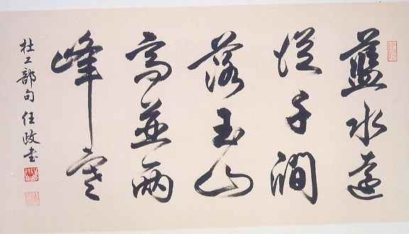 纸本 单片 释文:蓝水远从千涧落,玉山高并两峰寒。 款识:杜工部句,任政书。 印鉴:任(白)、诗酒趁年华(朱) 尺寸:65×33cm