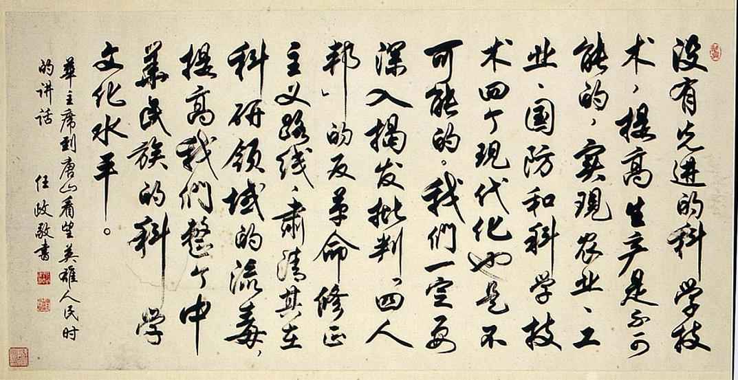 纸本 横披 释文:没有先进的科学技术,提高生产是不可能的,实现农业、工业、国防和科学技术四个现代化也是不可能的。我们一定要深入揭发批判“四人帮”的反革命修正主义路线,肃清其在科研领域的流毒,提高我们整个中华民族的科学文化水平。 款识:华主席到唐山看望英雄人民时的讲话,任政敬书。 印鉴:任政六十岁后书(白)、家在天台雁宕之间(朱) 藏印:陈红亮李宁珍藏印(白) 尺寸:64×132cm