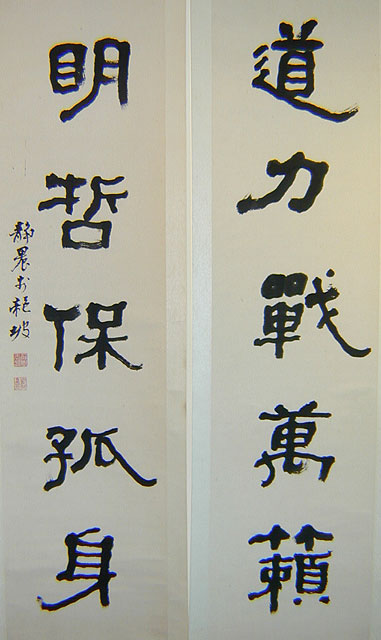 书艺原是业余兴趣,广博吸收前人笔意,宗法明末倪鸿宝,奇肆古雅是其风格。