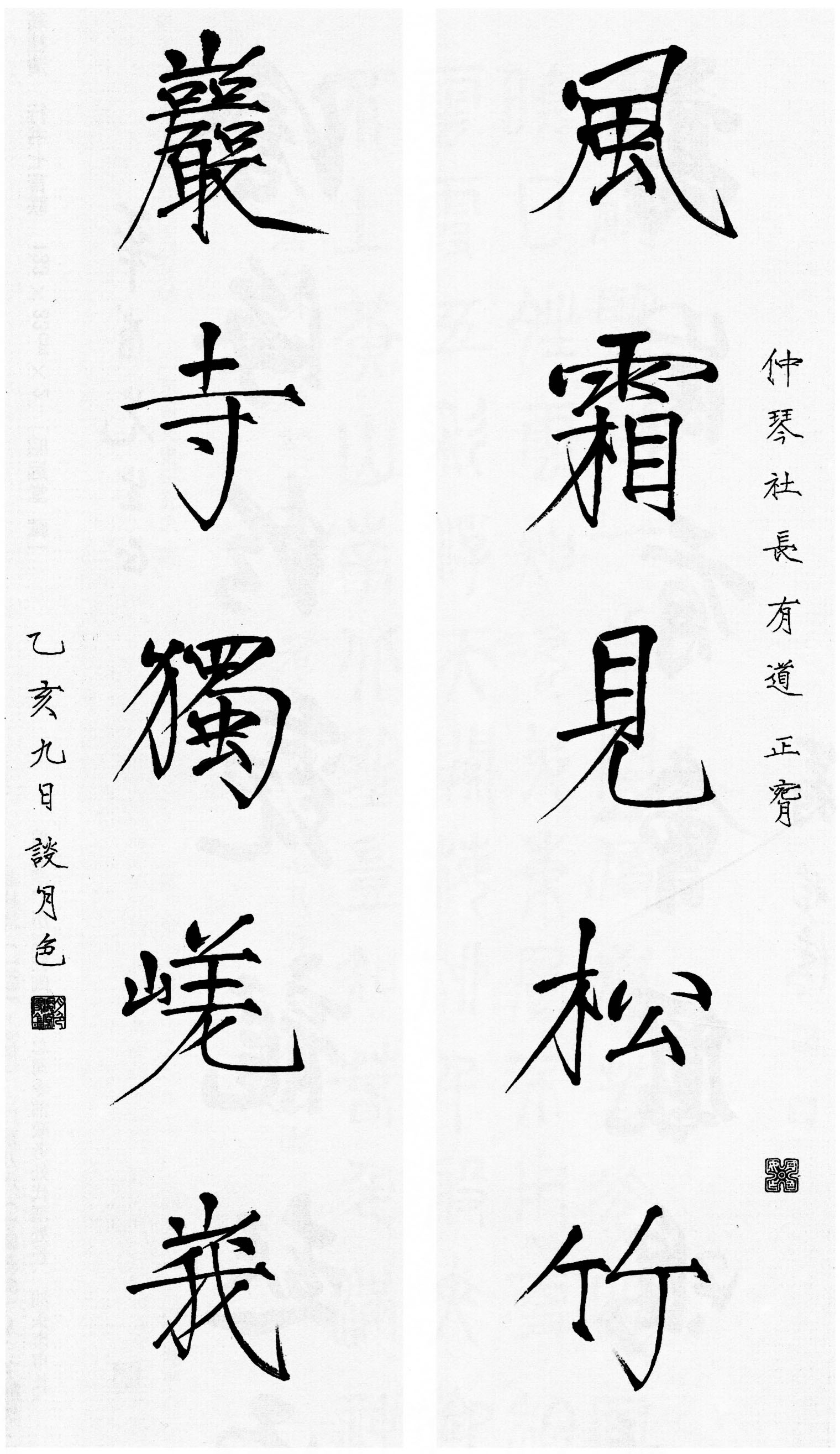 谈月色《风霜岩寺五言联》楷书 78×20cm×2 平居藏