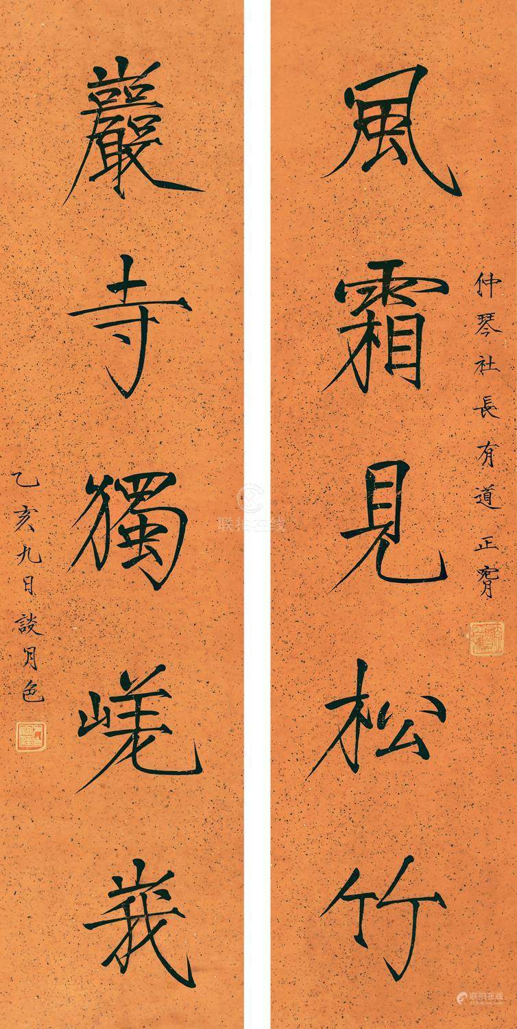 谈月色《风霜岩寺五言联》楷书 腊笺纸本 79×19cm×2
