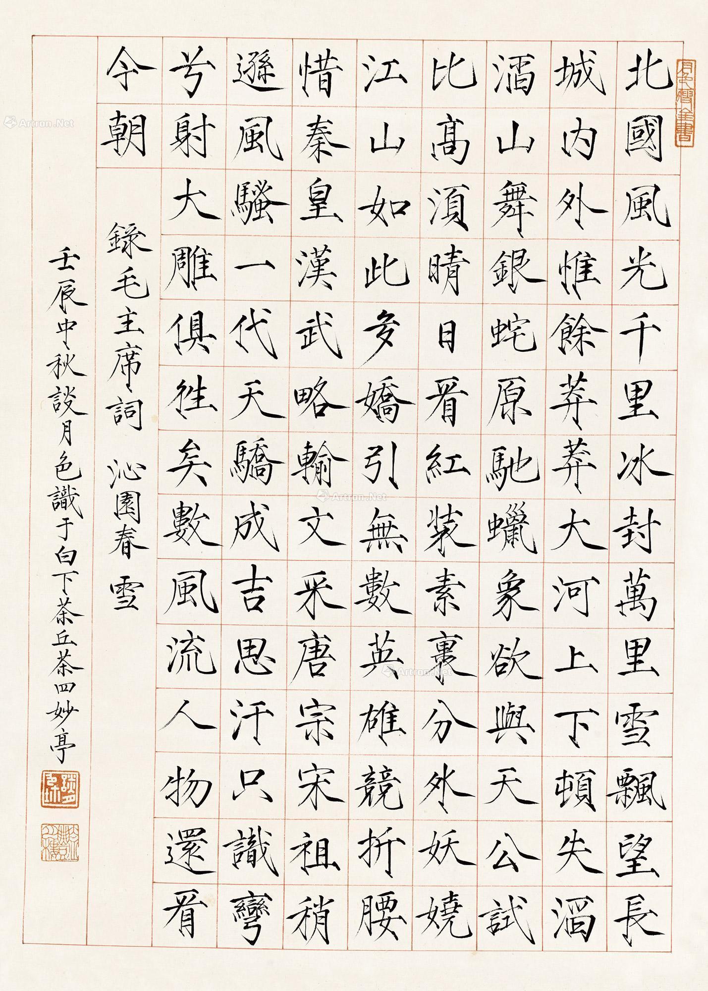 款识:录毛主席词,沁园春雪,壬辰中秋,谈月色识于白下茶四妙亭。