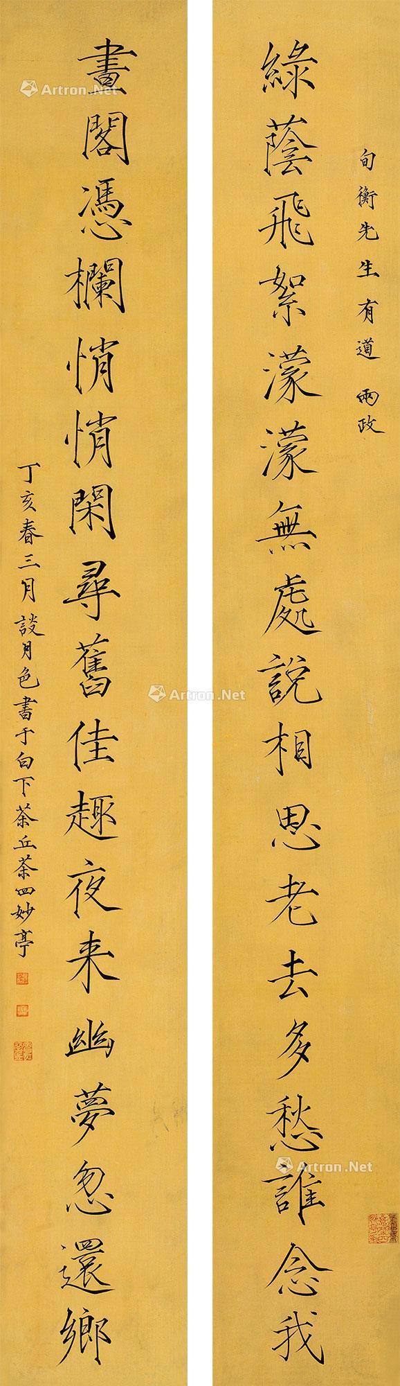 释文:绿荫飞絮,濛濛无处说相思,老去多愁谁念我。画阁凭栏,悄悄闲寻旧佳趣,夜来幽梦忽还乡。 款识:旬衡先生有道两政,丁亥春三月,谈月色书于白下茶丘茶四妙亭。 钤印:谈月色、溶溶、宾虹衣钵、茶思茶熹茶四妙亭印 说明:北京华辰拍卖2017秋季拍卖会 拍卖时间 2017-12-16 估价 RMB 20,000-30,000