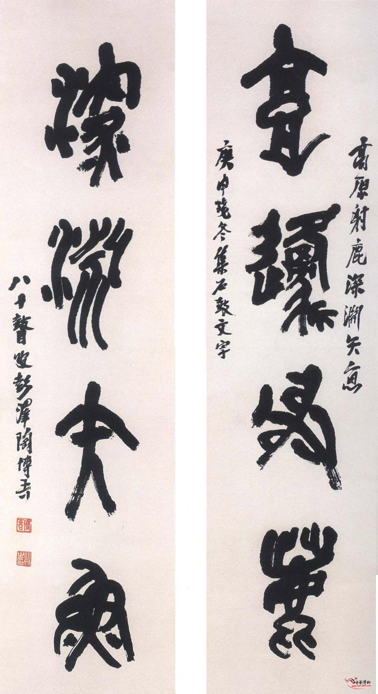 集石鼓文四言联 (又一) 纵138厘米,横34厘米。