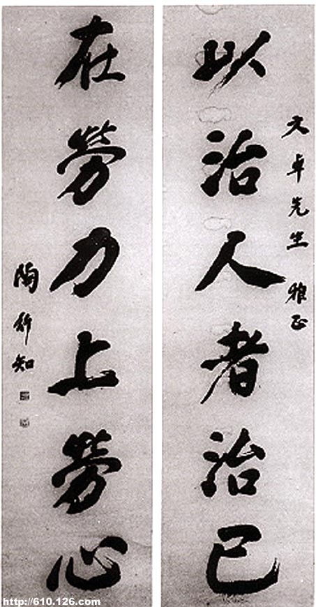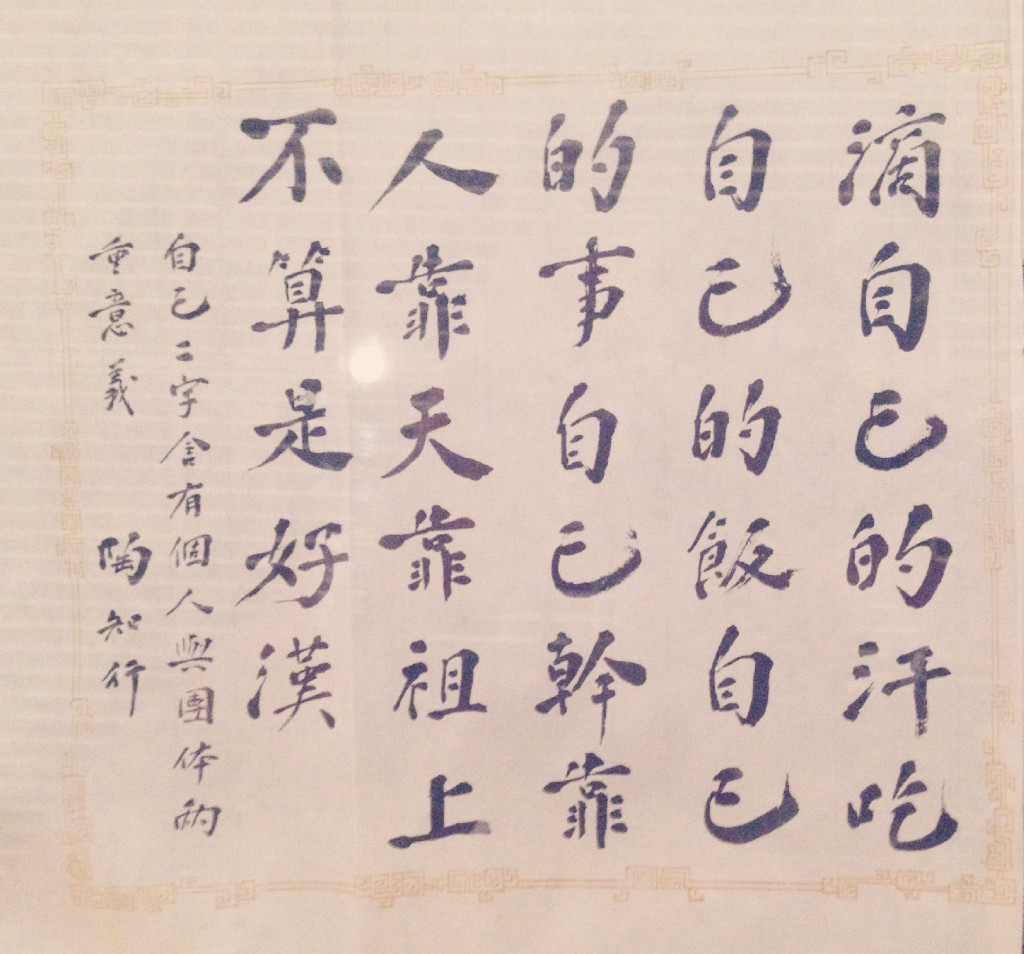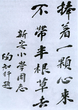 陶行知早年私塾受过传统学习,临习过颜柳楷体,后受当时北魏书风影响,书法极具个性,功力精湛,笔法古拙苍劲。他曾经为办学义卖过不少手迹,皆手写大字,不拘一格,然其手札更具天性。